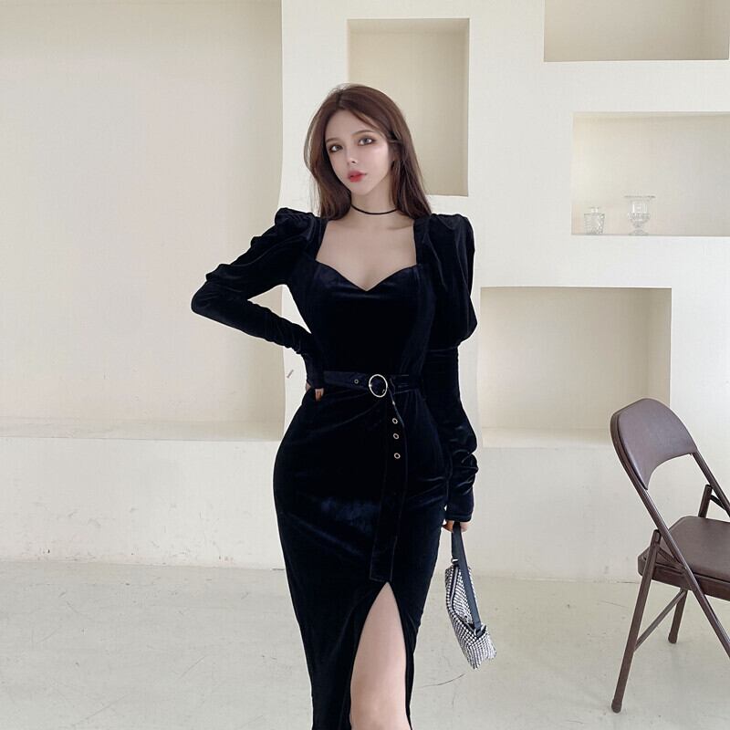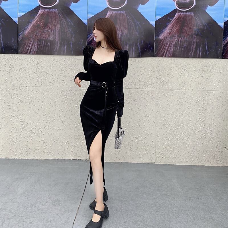 フランスのレトロシックなデザインセンススクエアネックパフスリーブスリムスリミングセクシーなスプリットベルベットドレス女性の秋と冬 オータム 秋物 ウィンター 冬物 スクウェア yingd99027074822