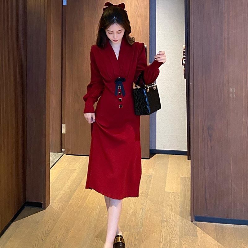 フランスのレトロなヘップバーンスタイルの赤い長い膝上セータードレススリムスリムセクシーなVネックニットドレス女性 ロング レッド yingd115792705
