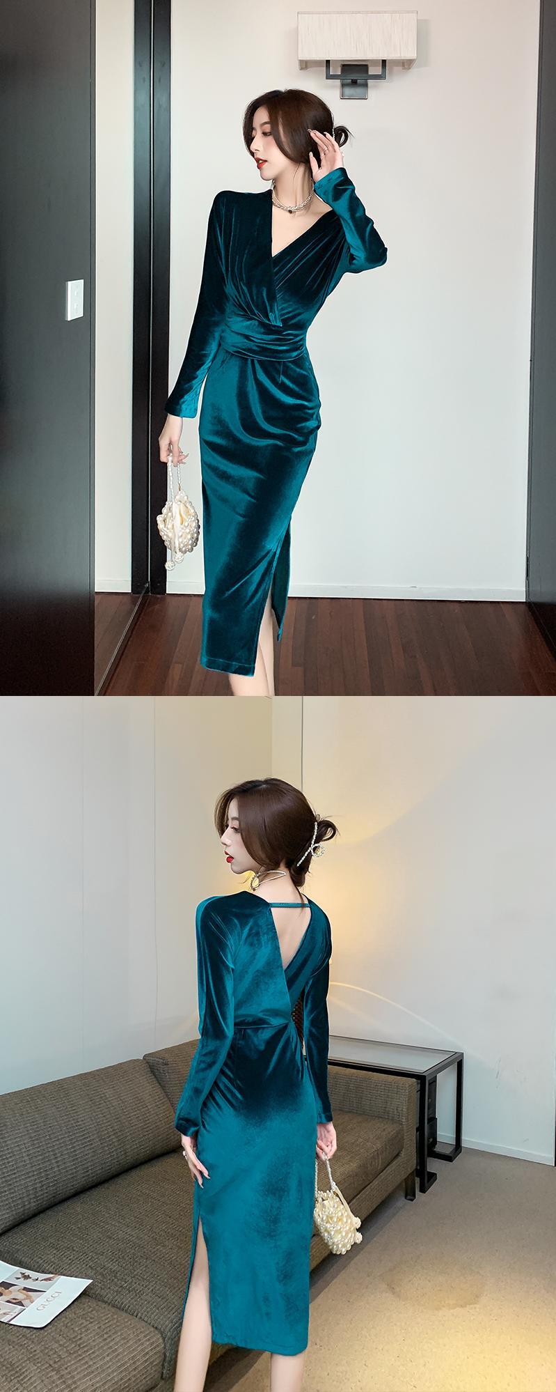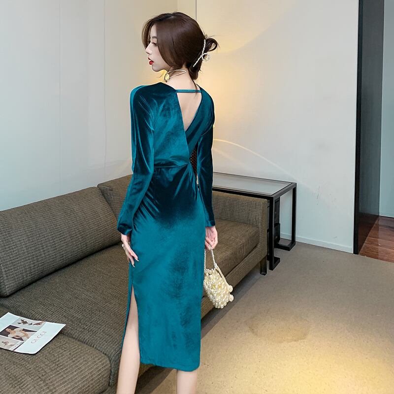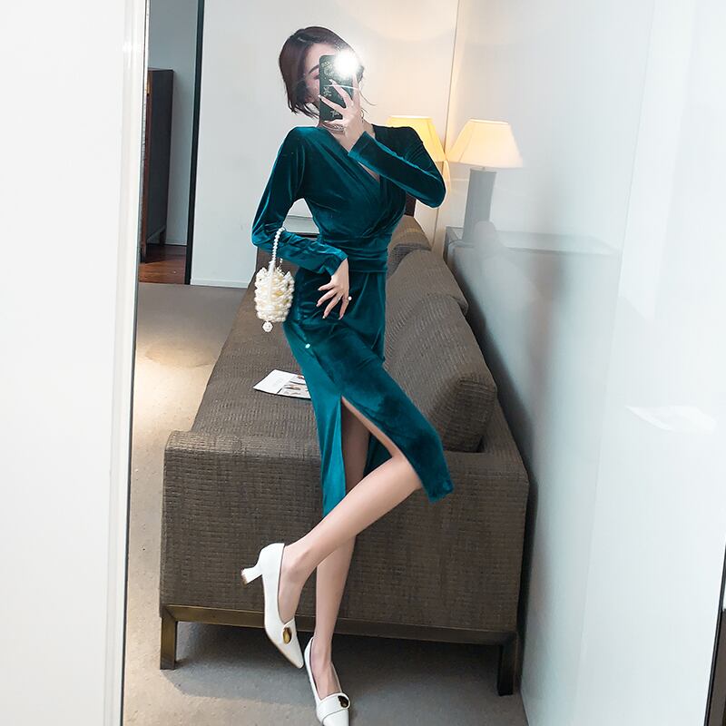 フロスティスタイルの婦人服、ハイレベルなセンス、軽やかなラグジュアリー、女性のセクシーなホルタードレス、自己啓発の気質、Vネックのベルベットドレスの女性 yingd78700560749