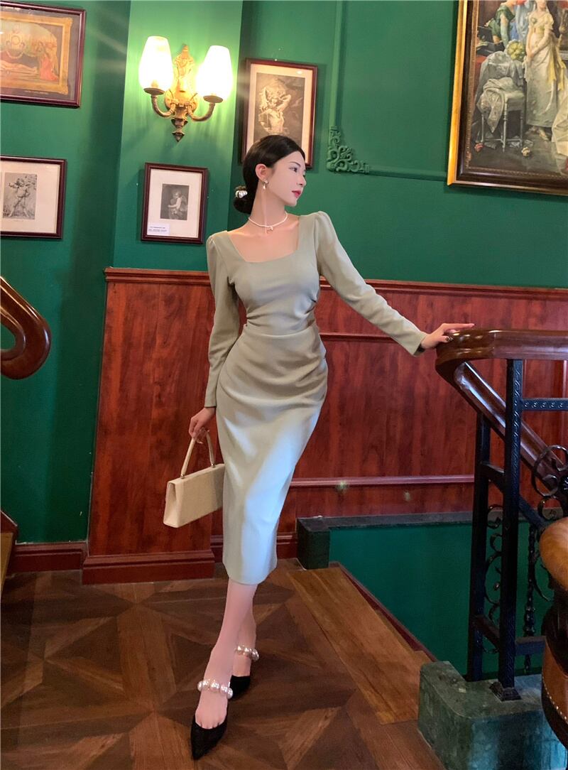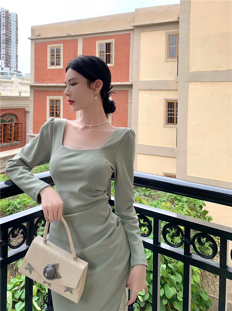 フランスのレトロな姉、軽い成熟したスタイル、高級感のある高級感、女性のセクシーな背中の開いたスクエアネックスプリット、スリムなドレスの女性 スクウェア yingd95990339131