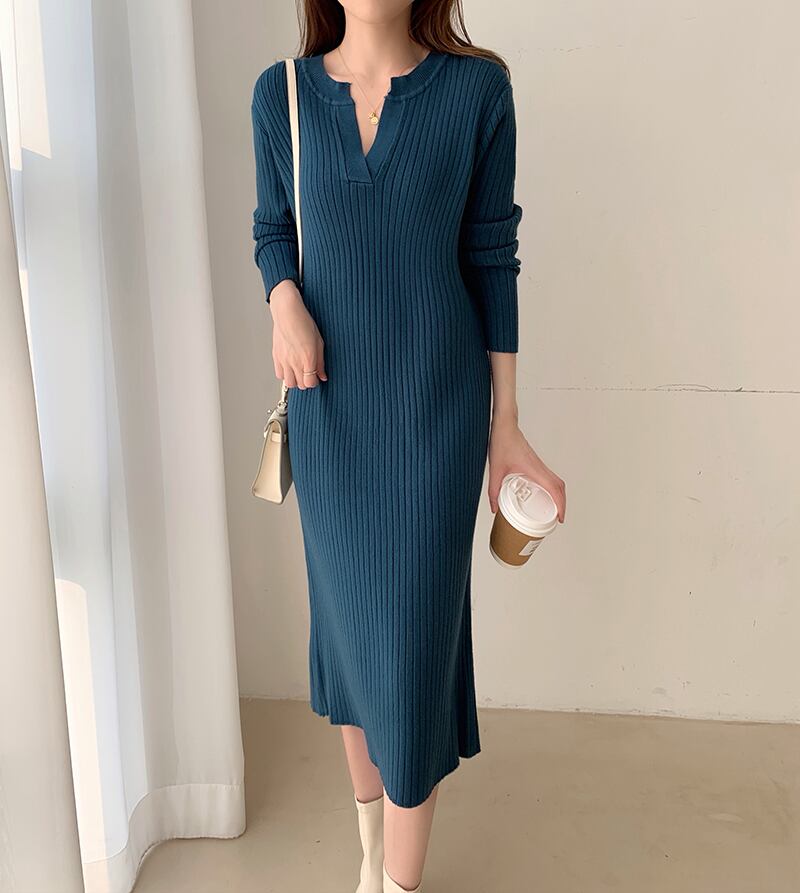 フレンチレトロルーズで怠惰なスタイルのロングオーバーザニーセータースカートデザインセンスVネックニットワンピース秋冬 オータム 秋物 ウィンター 冬物 yingd24023350935