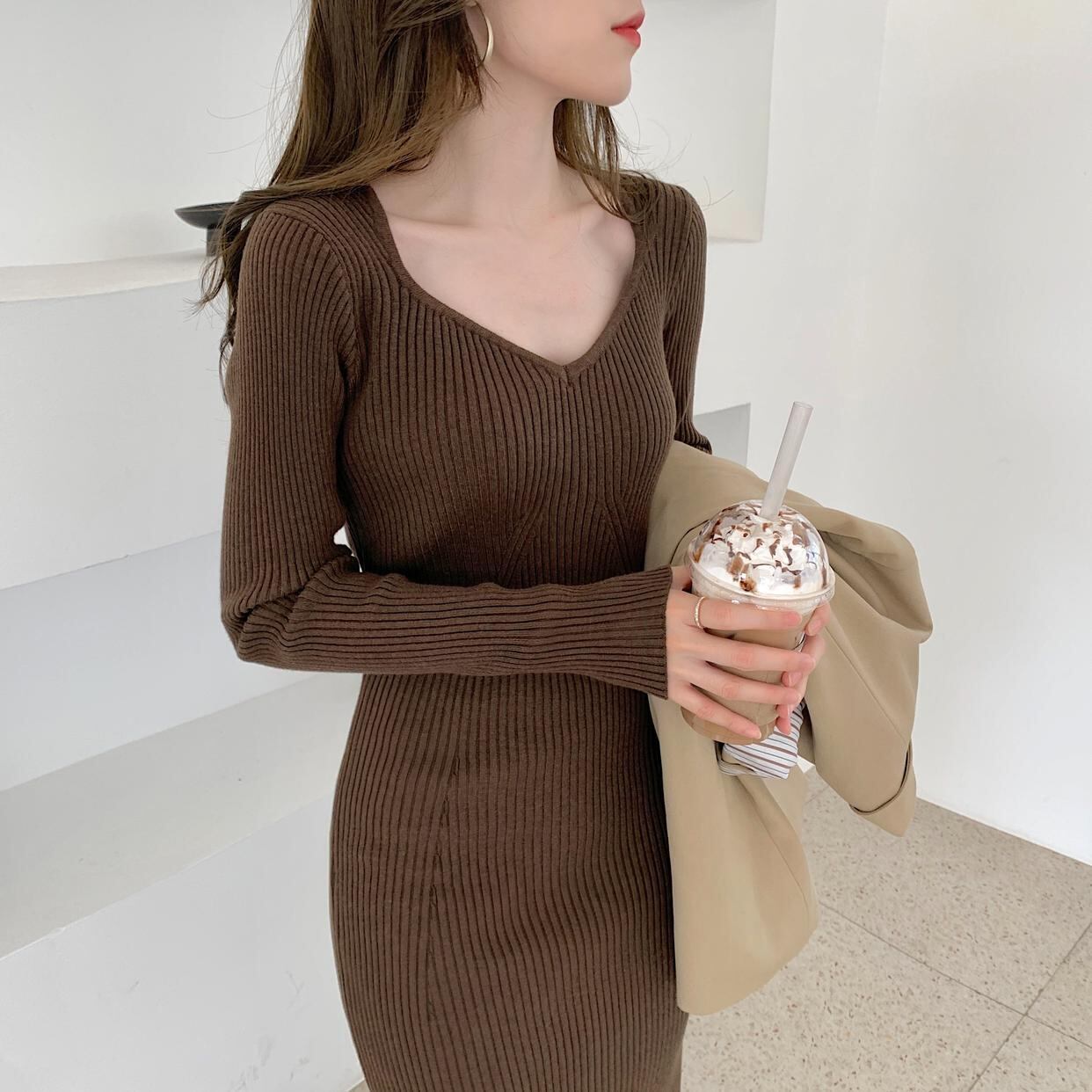 フレンチレトロシックロングバージョンオーバーニーセータードレススリムスリミング気質セクシーベースニットワンピース秋冬 オータム 秋物 ウィンター 冬物 yingd81554103806