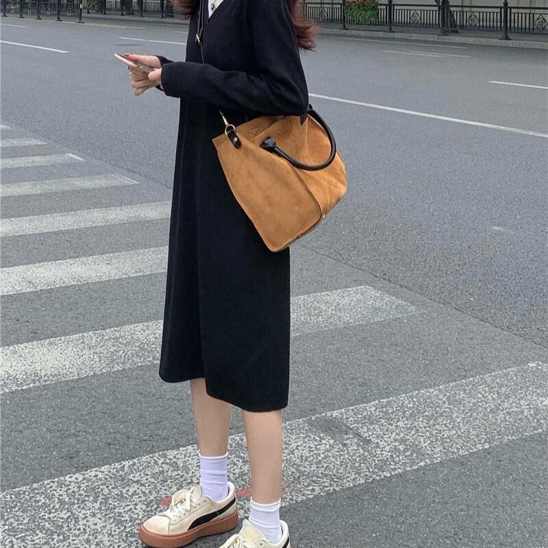 ロングバージョンのオーバーザニーセータードレスルーズで怠惰な風ストレートで薄いVネックベースのニットドレス秋冬コート付き オータム 秋物 ウィンター 冬物 yingd93111773194