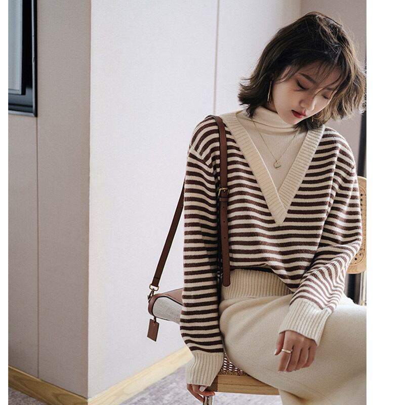 ストライプ2021年春秋エインスタイルフェイクツーピースハイネックレトロVネックセータールーズワイルドレディースステッチセーター スプリング 春物 オータム 秋物 yingd21301437820