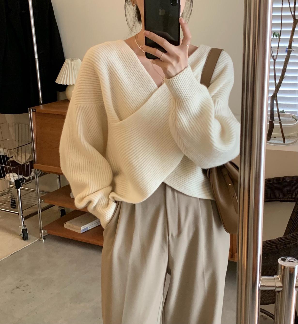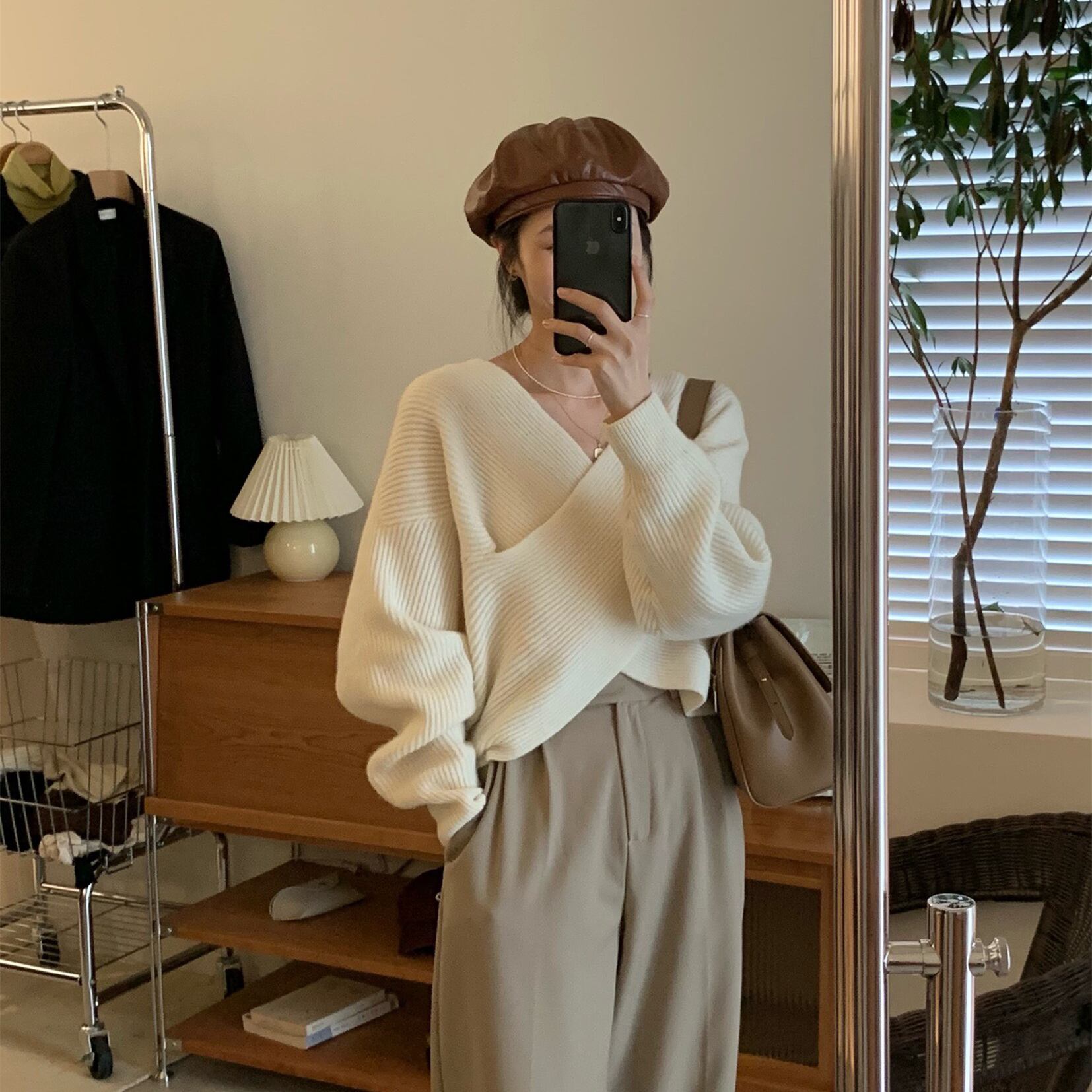 セーター女性の秋と冬の新しいデザインセンスニッチレトロなese怠惰なスタイルルーズVネック長袖プルオーバーセーター ロング オータム 秋物 ウィンター 冬物 yingd45088978501