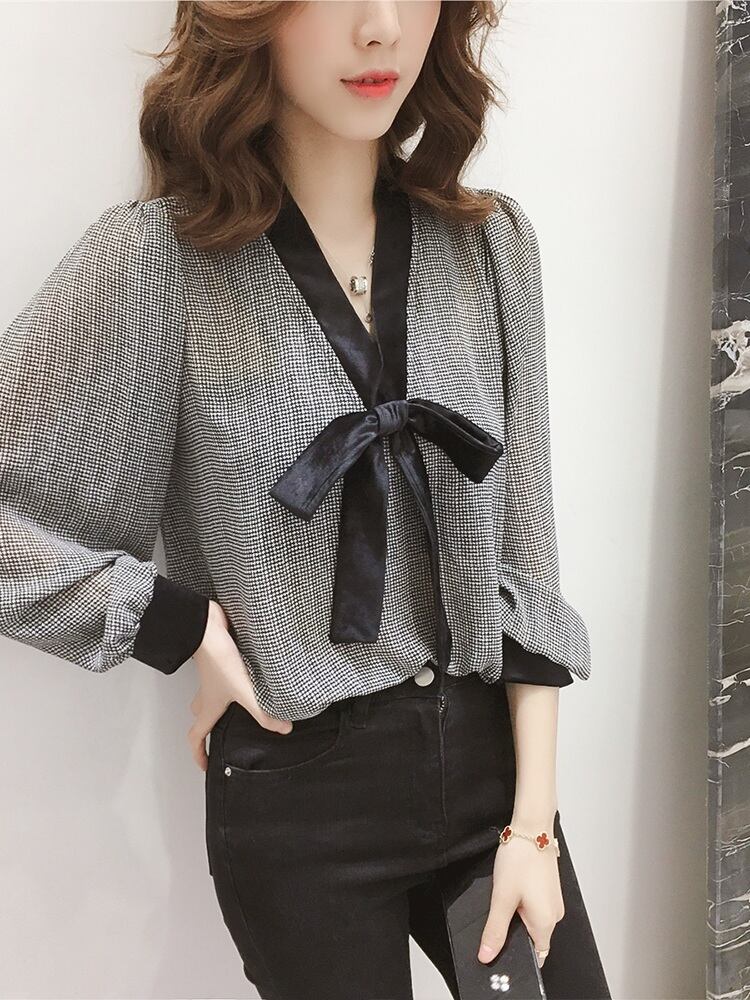 2019年秋新バージョンVネック蝶ネクタイランタンスリーブチェック柄シフォンシャツレディース長袖ルーズシャツトレンド ロング リボン オータム 秋物 yingd38755652749
