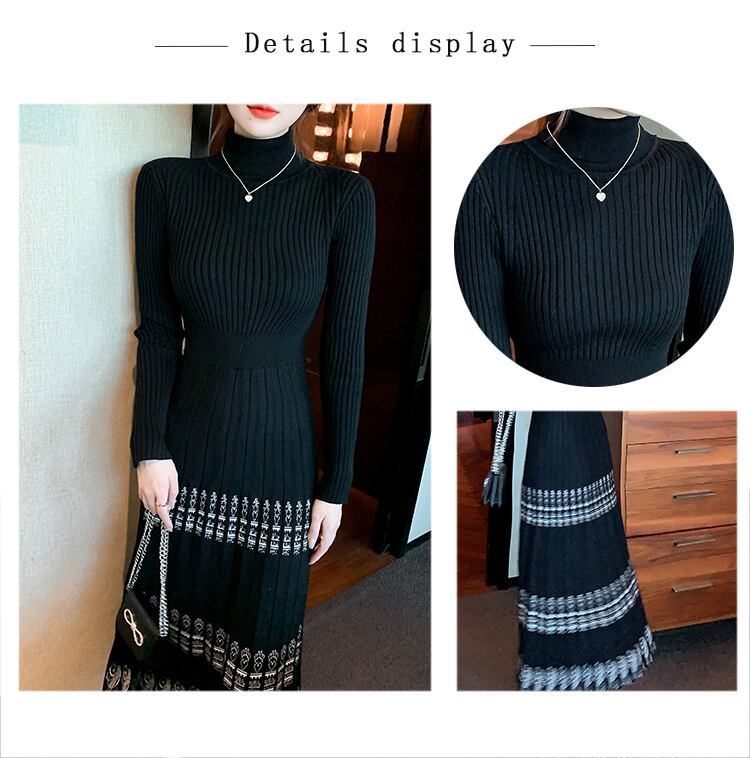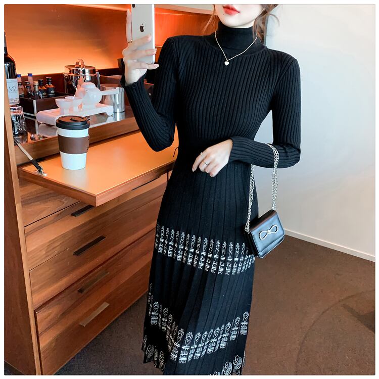 ロングオーバーニーセータースカートデザインのフレンチレトロコートプリーツハイネックニットワンピース秋冬感 オータム 秋物 ウィンター 冬物 yingd39999080554