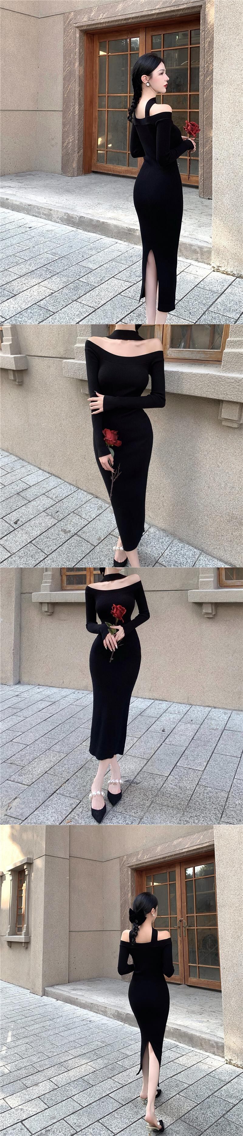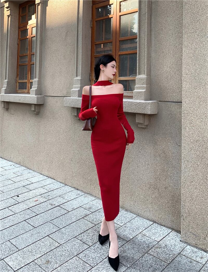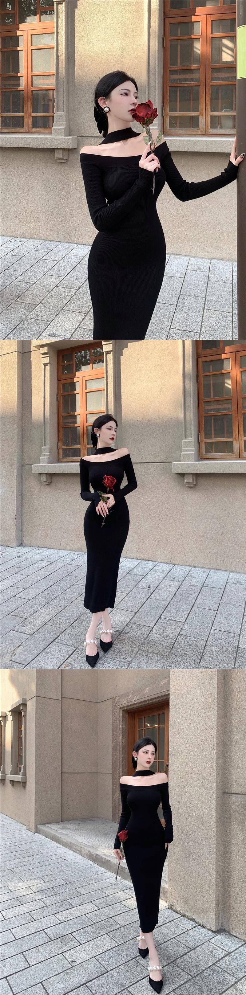 フランスのレトロなヘップバーンスタイルのシックなデザインセンスニッチネックセータースカートセクシーバッグヒップボトミングニットドレス yingd4992170958
