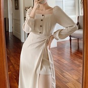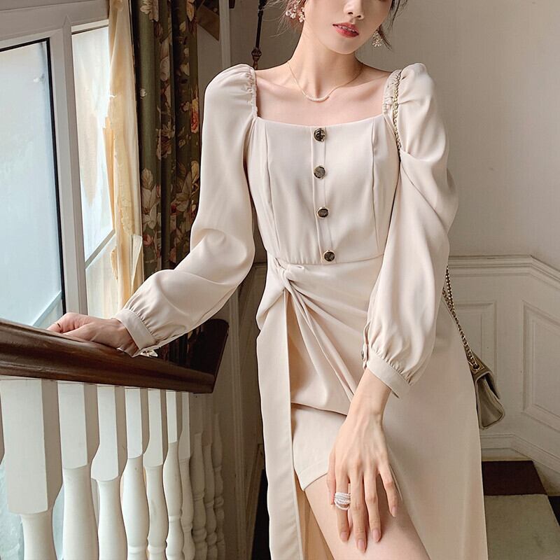 フランスのレトロなデザインのスカート、軽く調理された風、スリット、注意深い機械、不規則な長袖の四角い首のドレス、女性の秋の服 ロング オータム 秋物 スクウェア yingd5574900438
