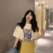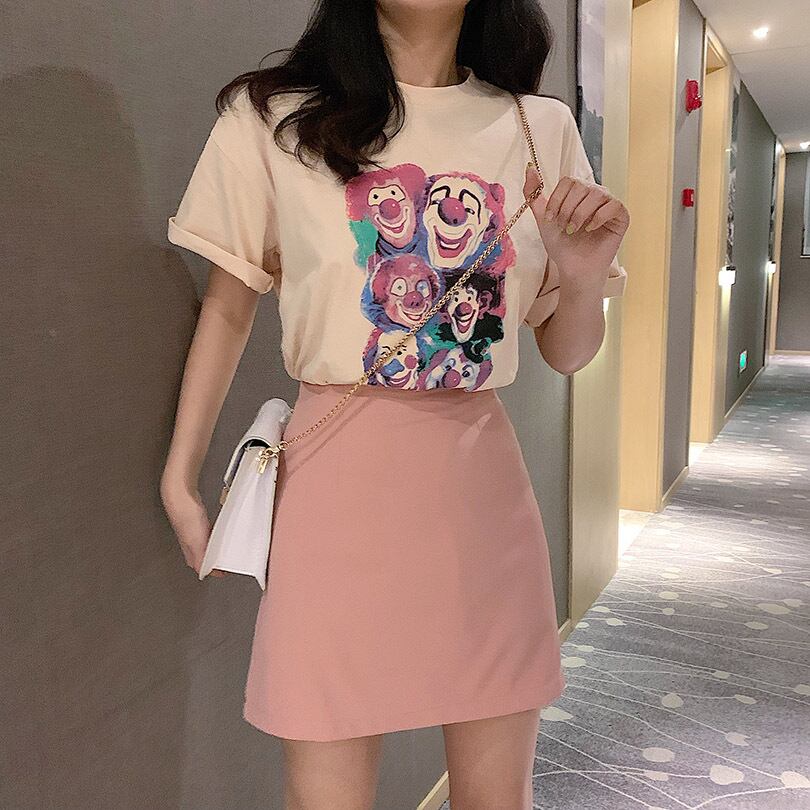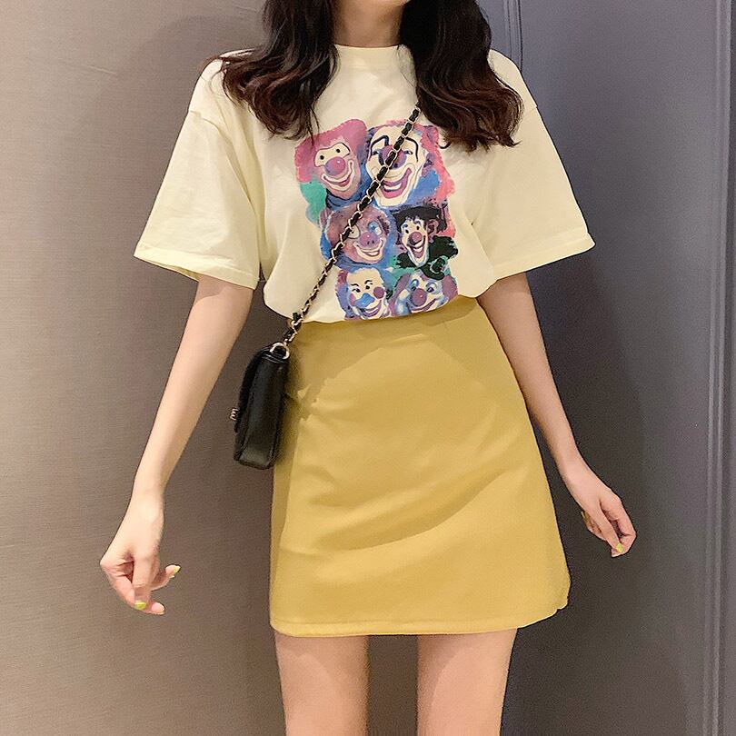 ショートスカートスーツ女性2019夏新バージョン半袖プリントTシャツトップハイウエストスリムAラインスカートツーピースセット ハイウェスト サマー 夏物 yingd27191944653