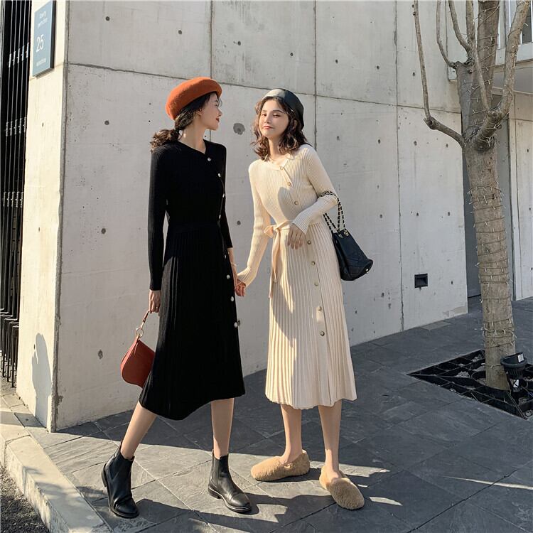 コート付きのロングスカートにミドル丈の膝上セータースカートを合わせ、薄手でボトムスのニットワンピースを女性の秋冬に オータム 秋物 ウィンター 冬物 yingd11144972173
