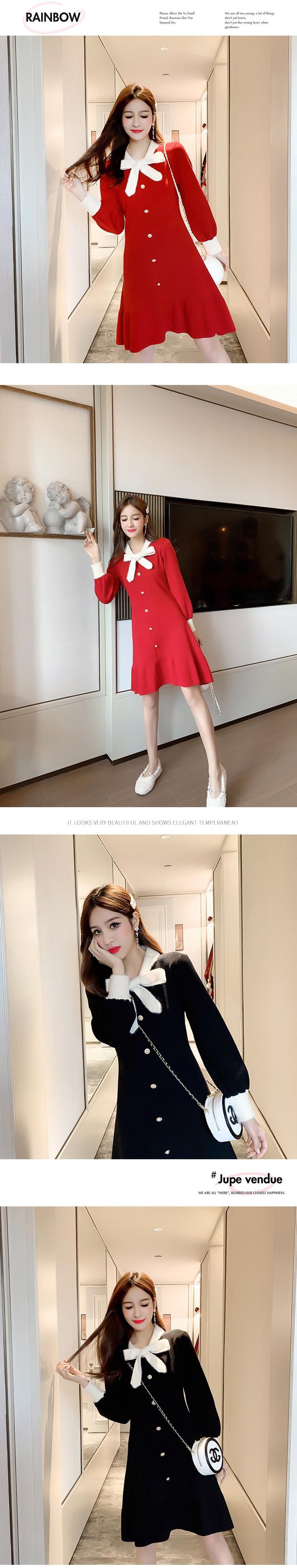 年のクリスマス赤いドレスの女性の秋と冬年の服の女性のフランスのレトロなウエストの薄いニットスカート レッド オータム 秋物 ウィンター 冬物 yingd46709667449