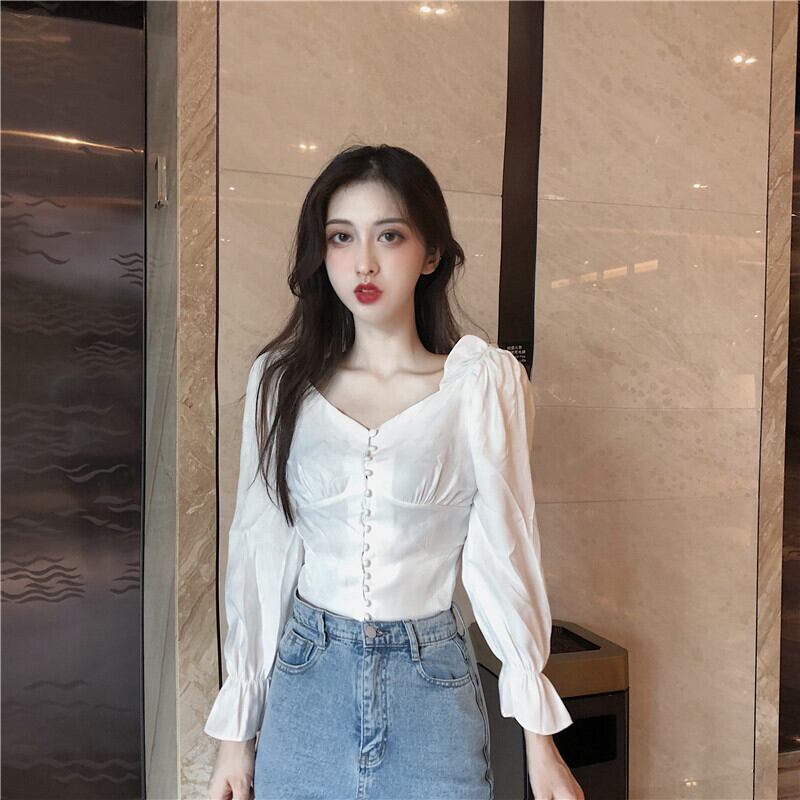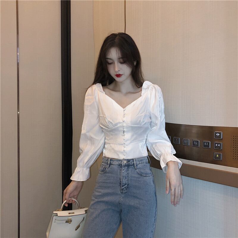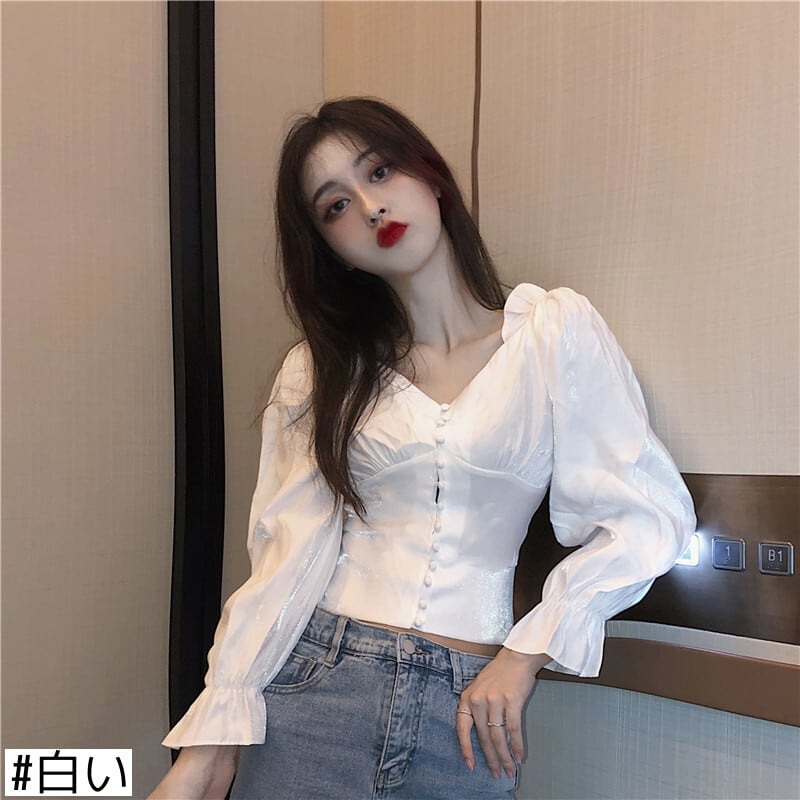 初秋トップス2020年新作レトロ香港スタイルスクエアカラーパフスリーブ半袖長袖シャツ女性のデザインセンスは小さい ショート ロング オータム 秋物 スクウェア yingd18899038152