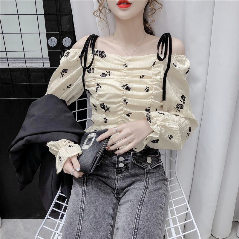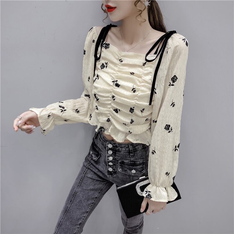 ワンショルダートップレディース2020年秋新作フレンチレトロスクエアカラー露出鎖骨ショート長袖シフォンシャツ ロング オータム 秋物 スクウェア yingd55065440053