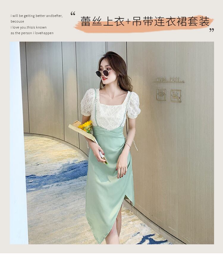 フレンチスタイルの洋風サスペンダースカートスーツゆうじえライトおなじみスタイルスクエアカラーレースシャツスカートツーピース女性夏 サマー 夏物 スクウェア yingd64016959353