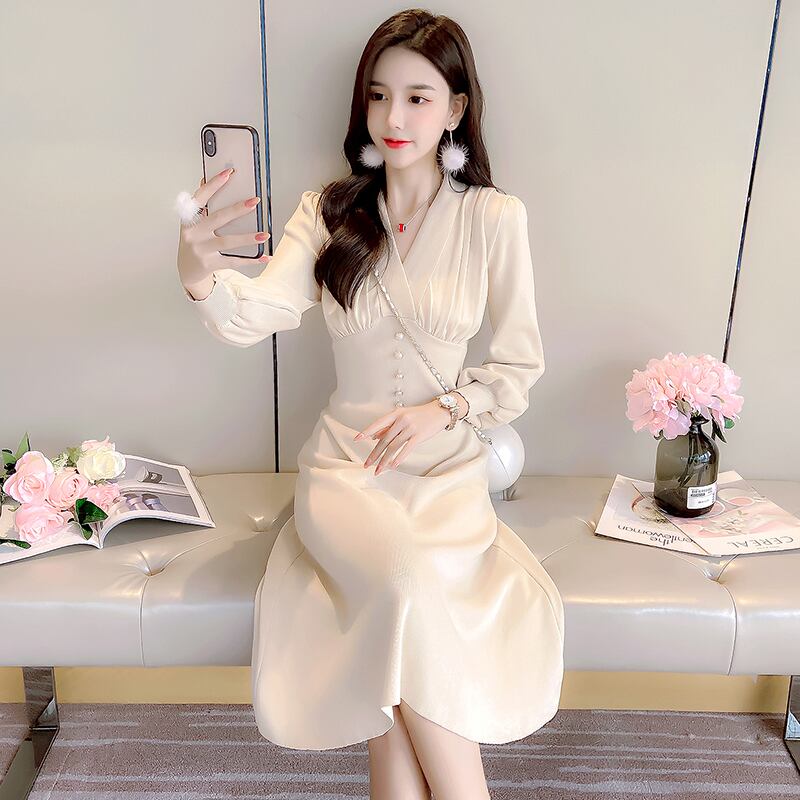 フランスのレトロなデザインセンスのニッチな膝丈ドレスウエストスリム気質ハイエンドランタンスリーブドレスレディース秋 オータム 秋物 yingd62348678780