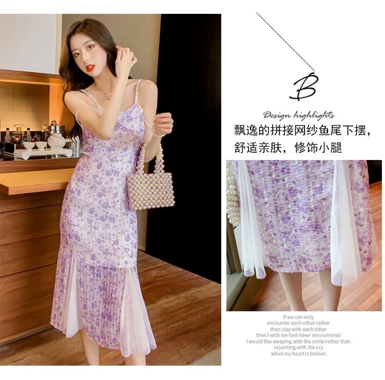 2021年の新しいフランスのレトロなデザインセンスニッチ外着セクシーなフィッシュテールパープルフローラルサスペンダードレス女性の夏 サマー 夏物 花柄 yingd27696118898