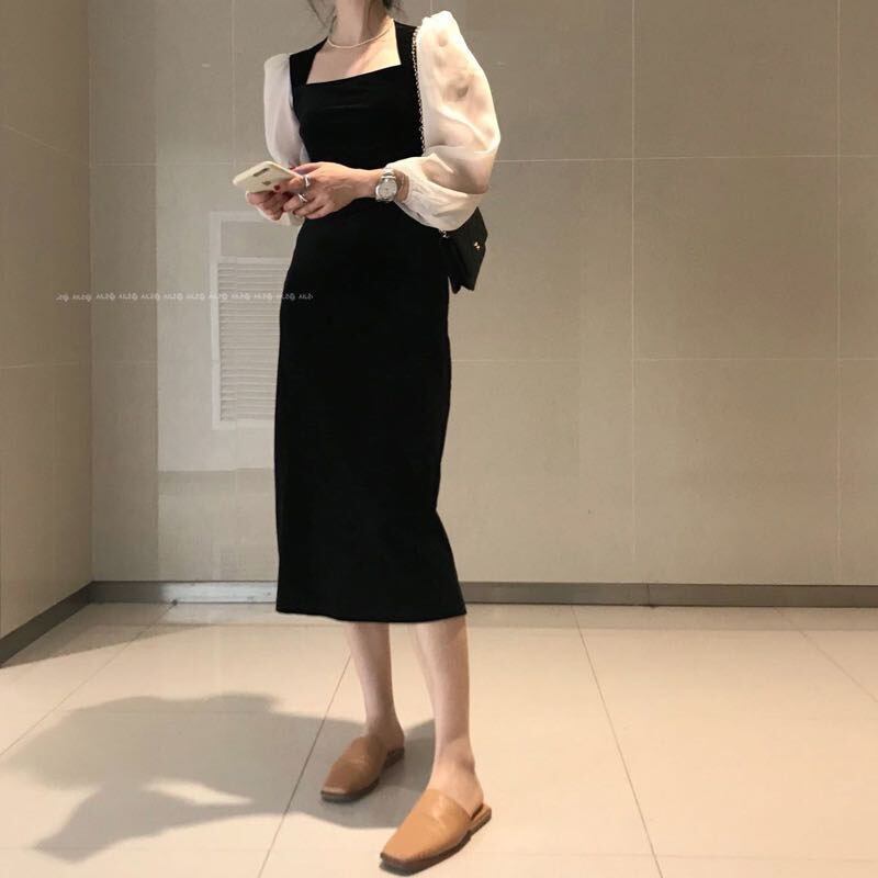 初秋のヘップバーンスタイルのパフスリーブ、ウエストと薄い気質のリトルブラックドレスハイエンドセンスロイヤルシスターライトおなじみのスタイルのスクエアカラードレス オータム 秋物 スクウェア yingd62785805367