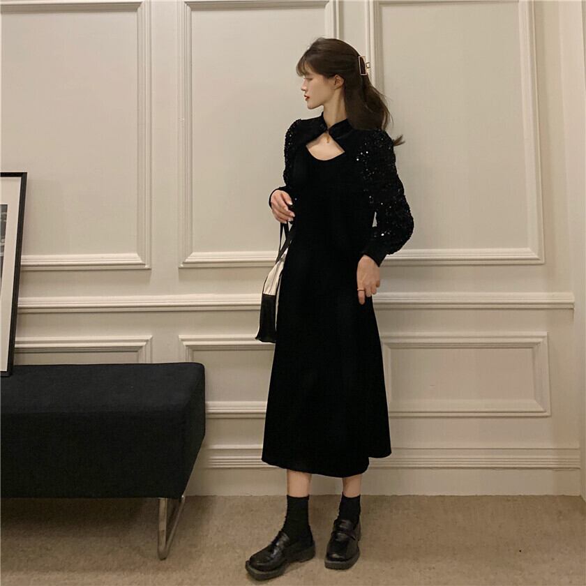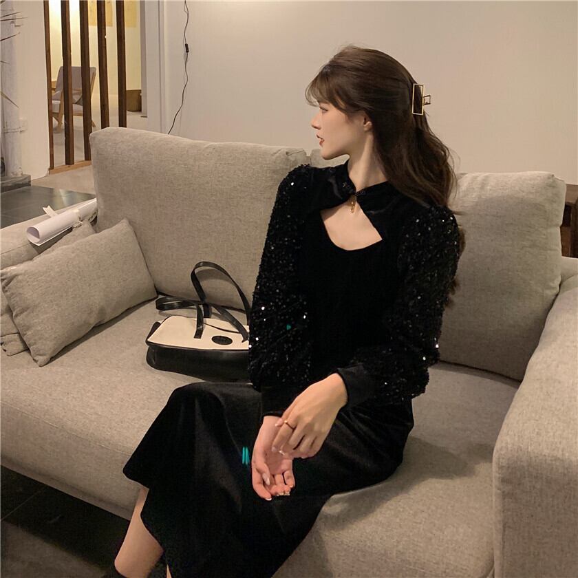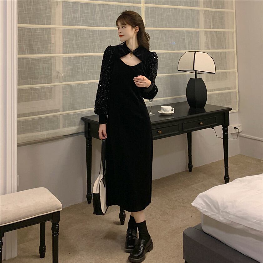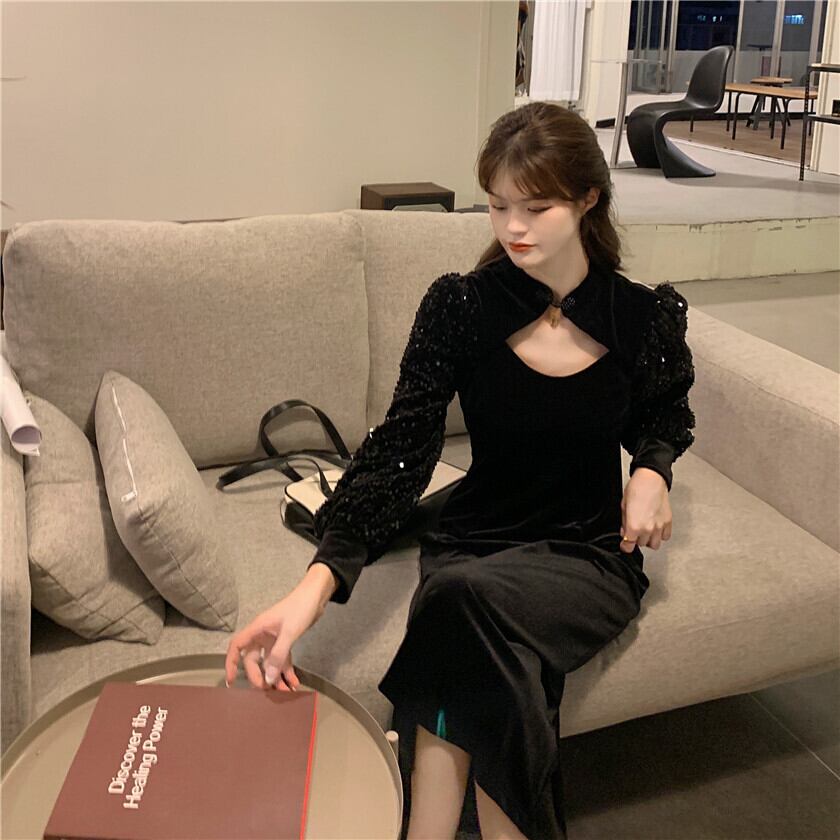 見事なスカートのハイエンドの年次総会のドレスの女性の腰と薄い気質は、チャイナドレスのベルベットドレスの冬のスタイルを改善しました ウィンター 冬物 スカート yingd84533925326