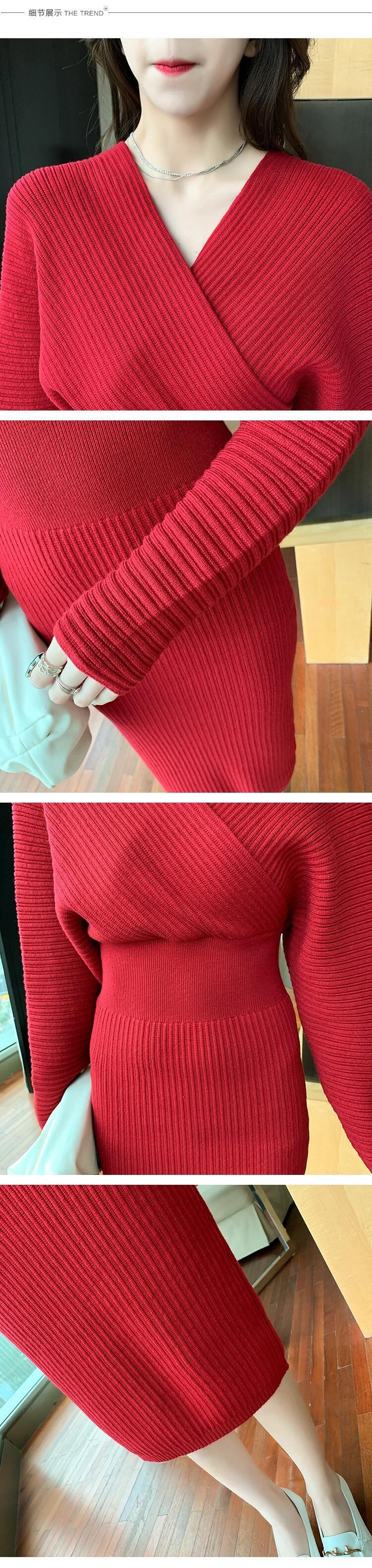 フランスのレトロなセクシーなセータードレスミドル丈スリムフィットスリム-ロイヤルシスターニットレッドドレス冬 ウィンター 冬物 yingd101965404