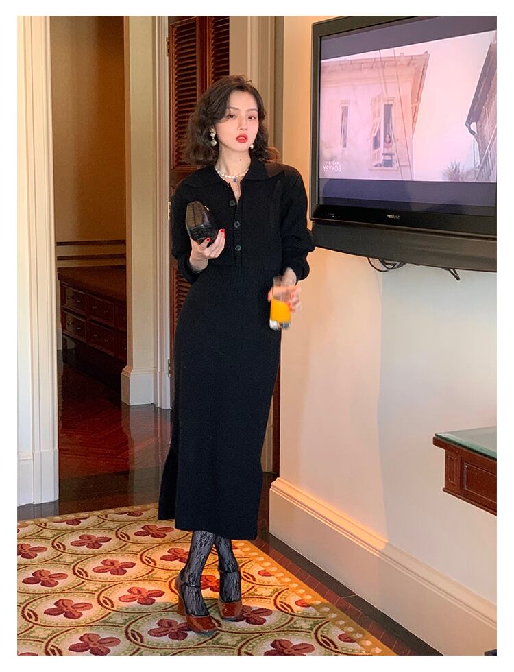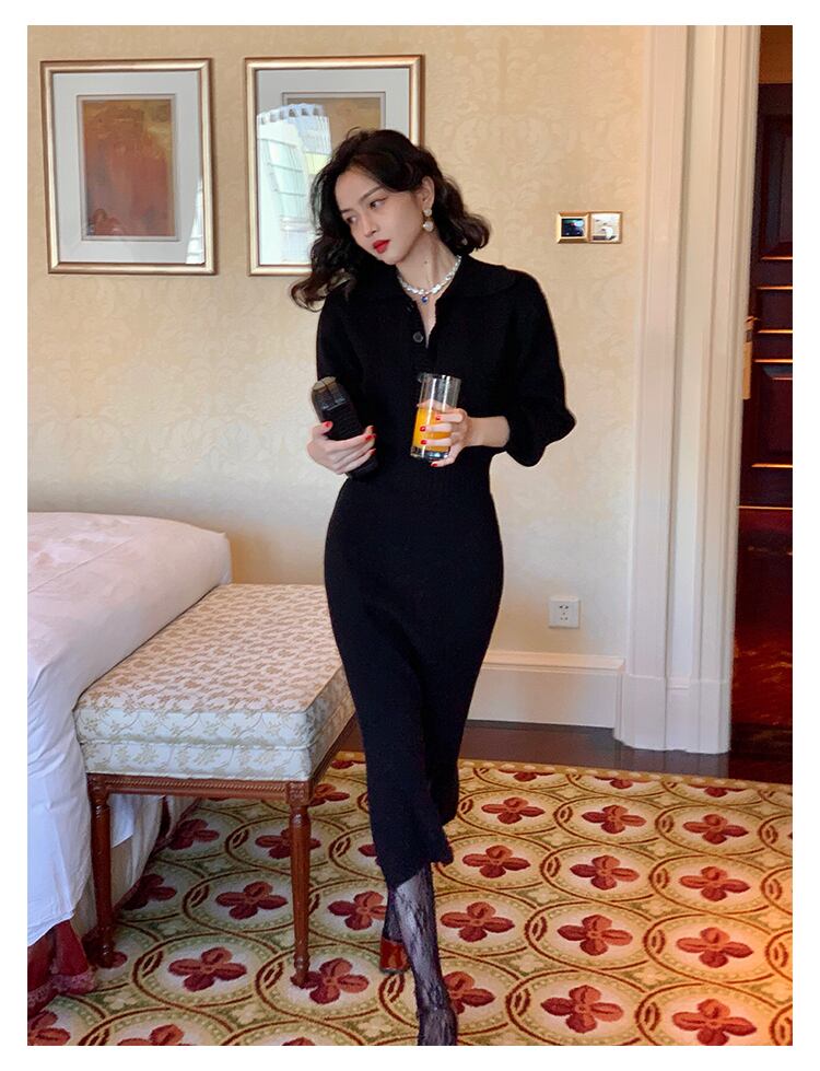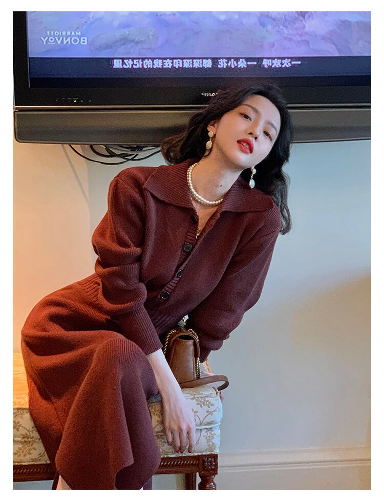 フランスのレトロなロイヤルシスターライトおなじみのスタイル長い膝上セータードレスは薄くてラペルボトミングニットドレス女性の秋と冬 ロング オータム 秋物 ウィンター 冬物 yingd81249701727