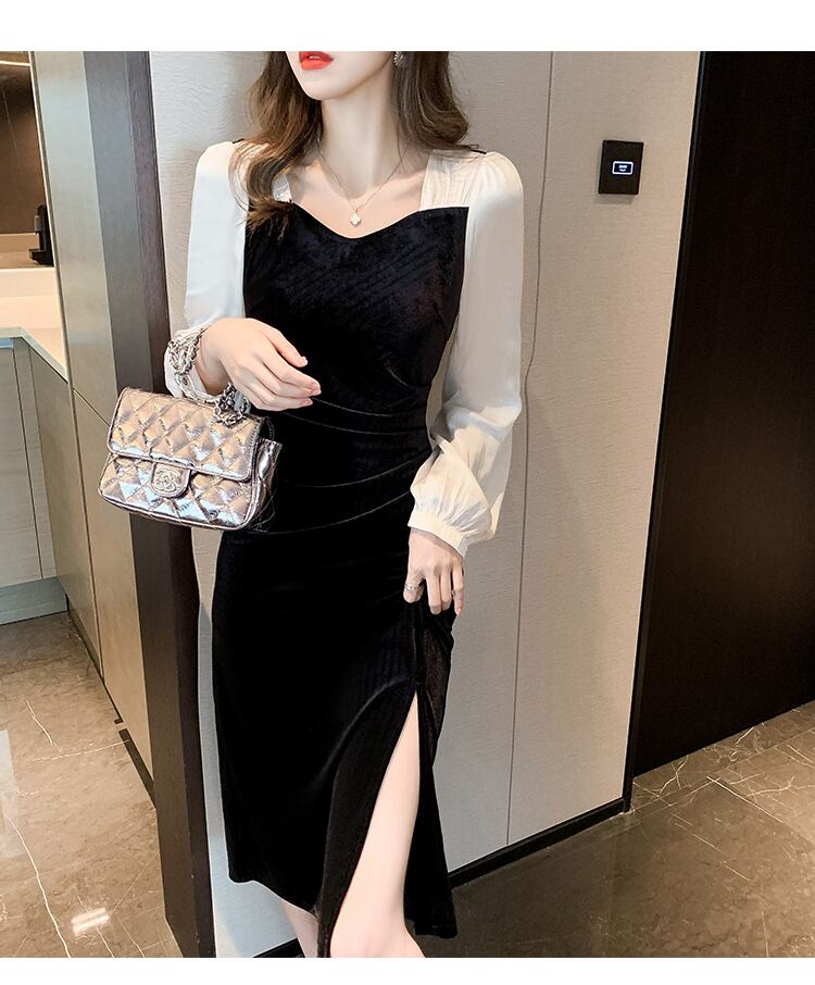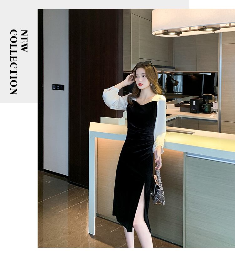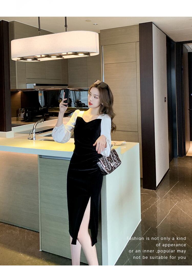 ヘップバーンスタイルのゴールドベルベットドレス2022年春新しい女性のハイエンドセクシーな揚げストリートロイヤルシスターセクシースリットロングスカート スプリング 春物 yingd48788099640