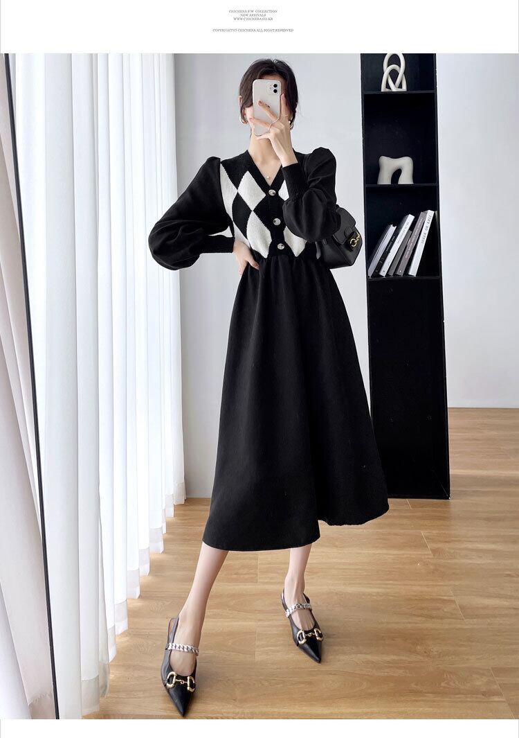 ネットレッドエクスプロージョンスタイルハイエンドスカートウエストスリム気質デザインセンスステッチニットVネックワンピースレディース秋冬 オータム 秋物 ウィンター 冬物 yingd98177825984