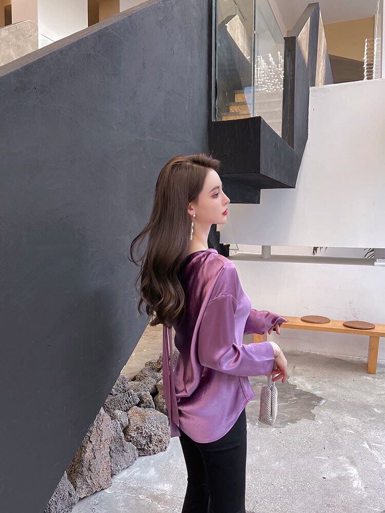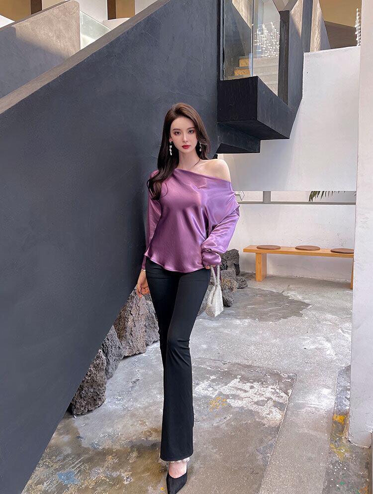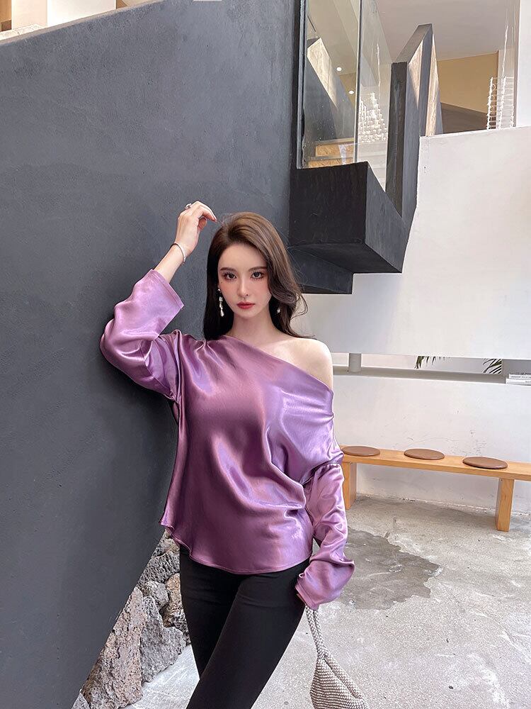 春物2022年新作レディースシックハイエンドセンスゆじえゆったりとした薄手のスラントカラーストラップレス長袖酢酸トップス ロング スプリング yingd15831301216