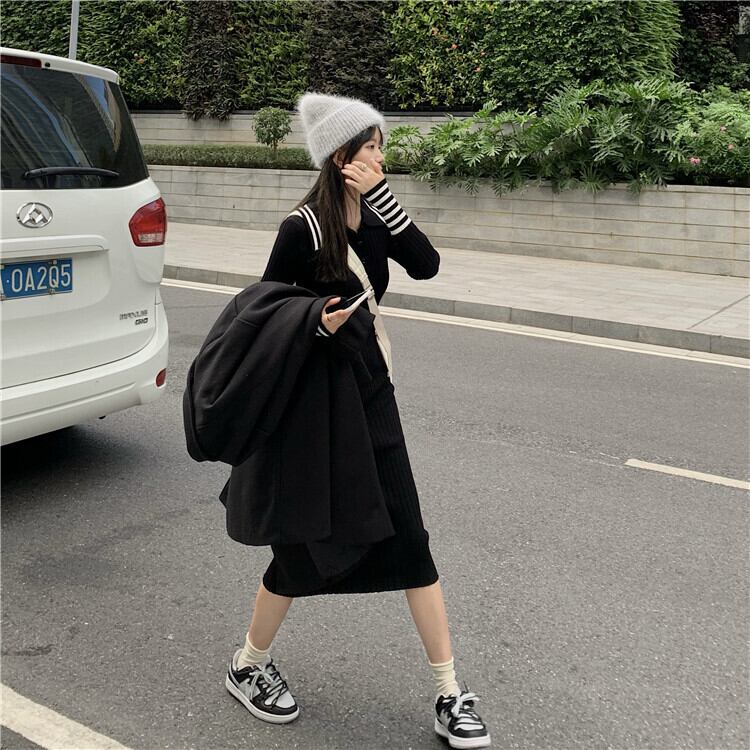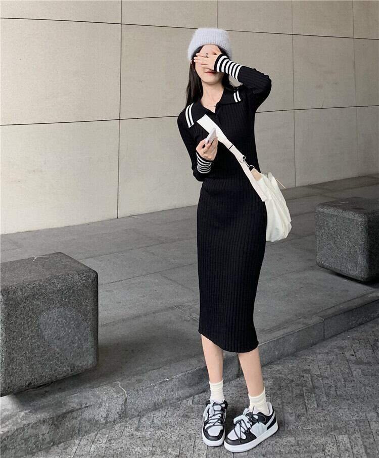 2022年春の新作レディーススタイルストライプラペルカジュアルニットワンピースレイジースタイルボトミングセータードレス スプリング 春物 yingd47478726798