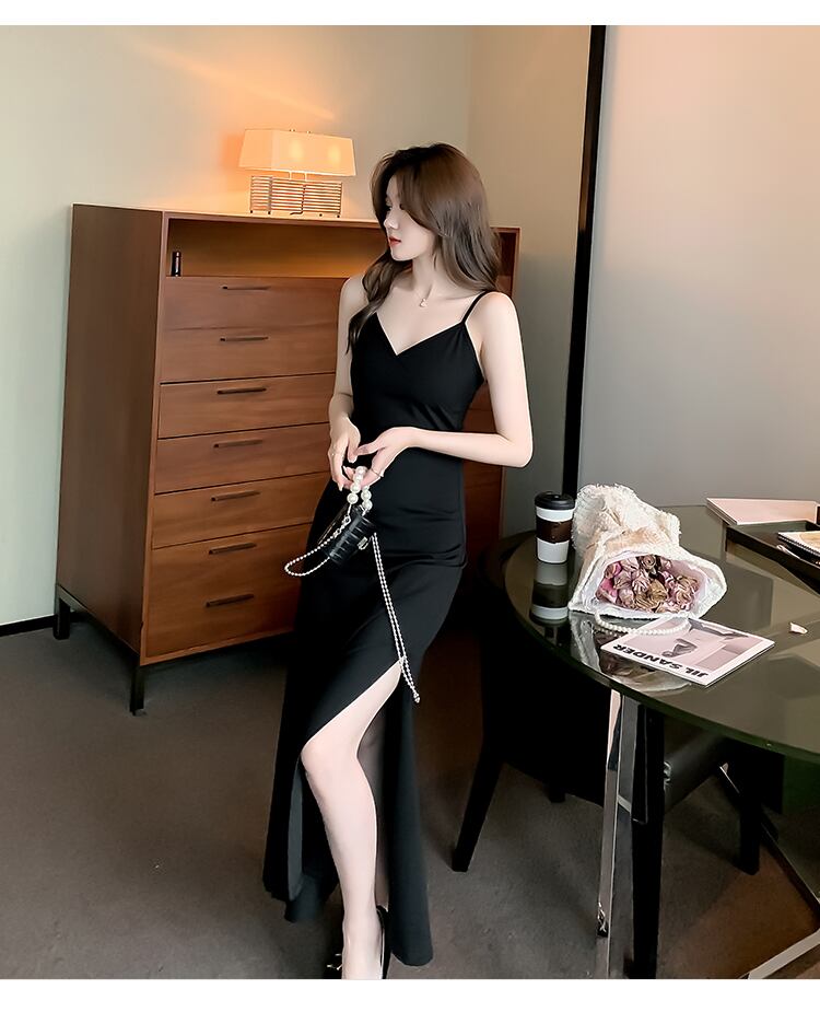 フランスのレトロなヘップバーンスタイルのシックなハイエンドサスペンダースカートスリムでセクシーなスリットVネックサスペンダードレス女性 yingd45450290474