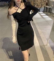 フランスのレトロな純粋な欲望スタイルのセクシーなスカートのスリムなフィット感と肩から離れた薄い気質の小さな男カラーマッチングニットドレス女性 ピュア yingd82913296322