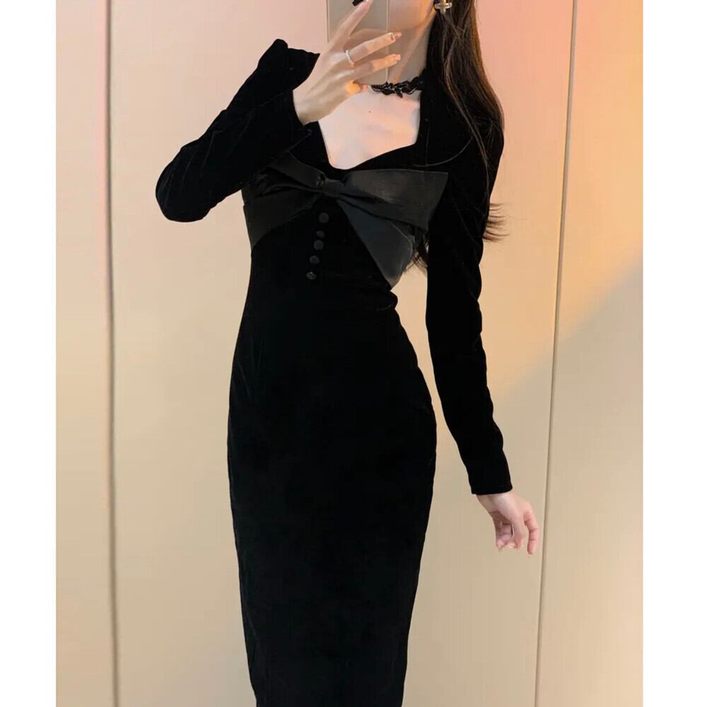 シックなハイエンドロイヤルシスターファンコートウィンタースカート人気人気ボウスリットベルベットドレスレディースロングスカート リボン 冬物 yingd58990638367