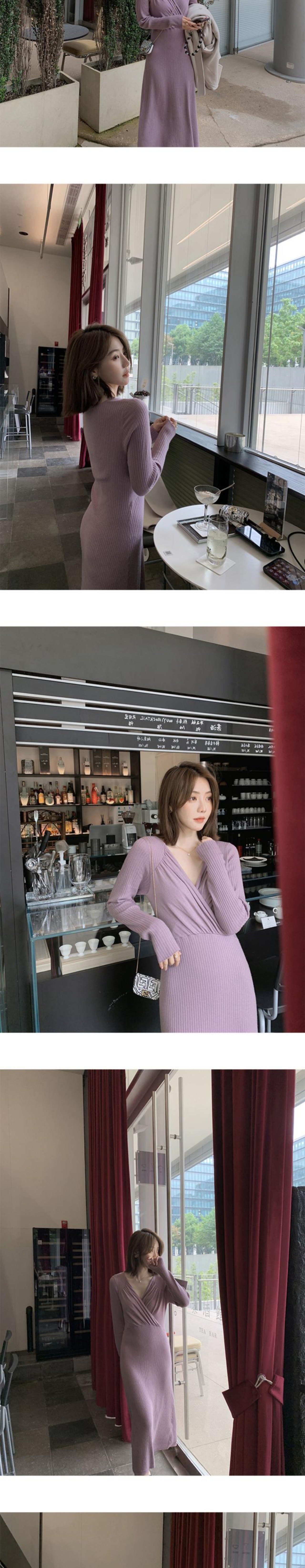 極寒風婦人服ハイエンドライトラグジュアリースリムフィットスリム気質デザインプリーツVネックニットワンピースレディース秋 オータム 秋物 yingd39264843494