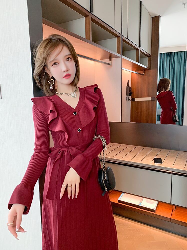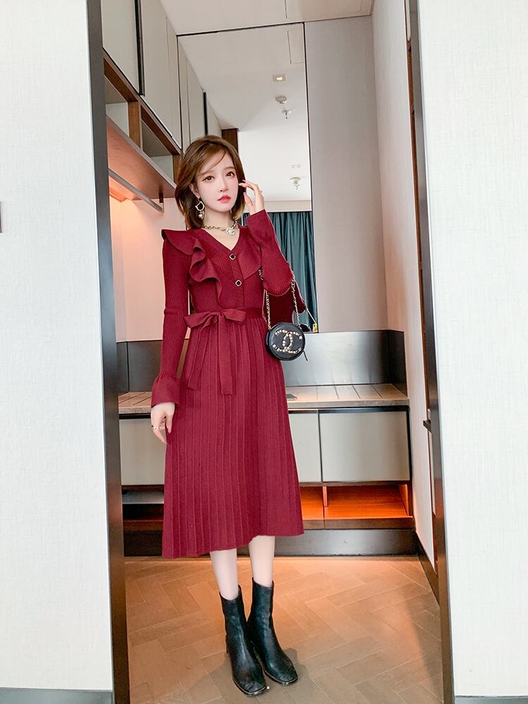 スカート2021爆発的な秋と冬の洋風セーターロングスカート品質のYujieファン赤いニットドレス レッド オータム 秋物 ウィンター 冬物 yingd80202829924
