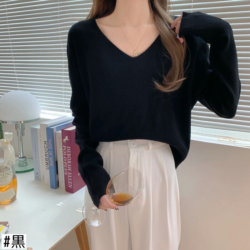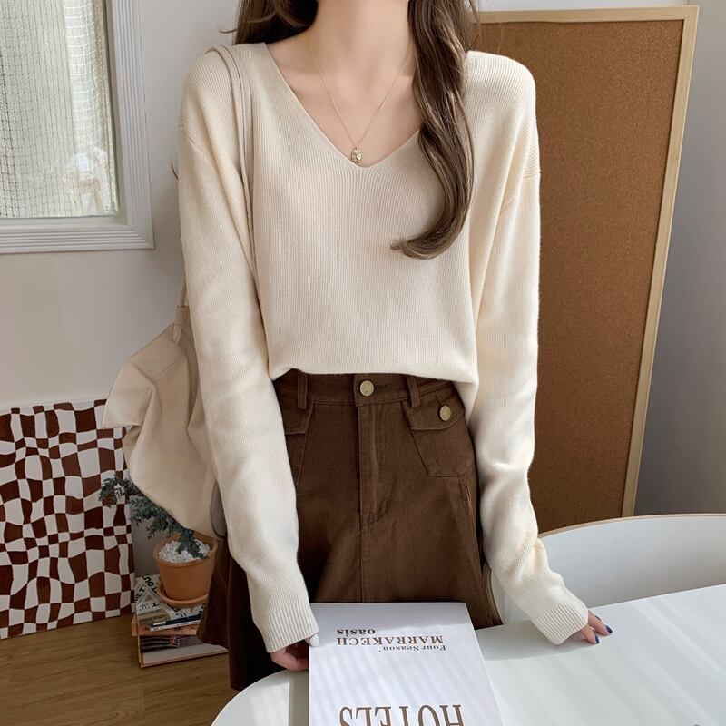 やさしい風のやわらかいもち米の女性のレトロなeseスタイル怠惰な緩くて薄いVネック長袖ボトミングニットセーターの女性 ロング yingd24662841971