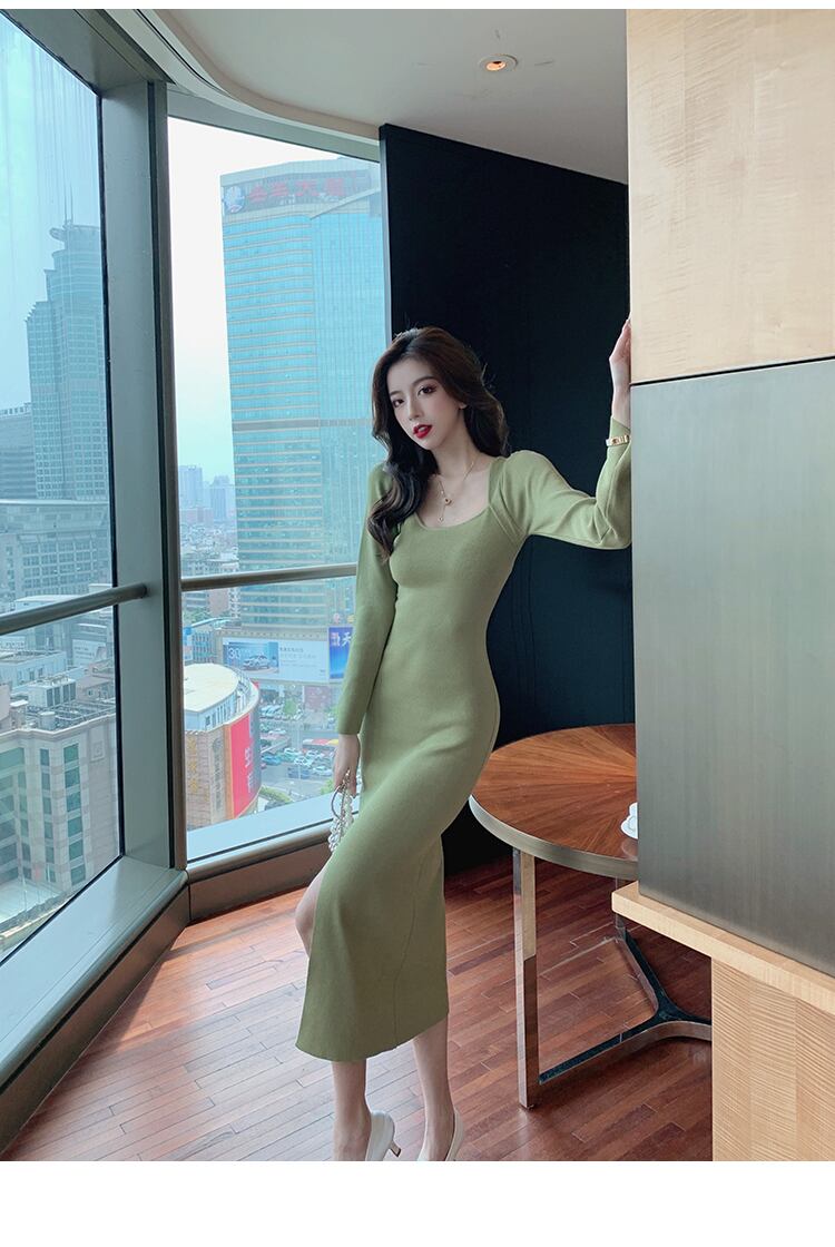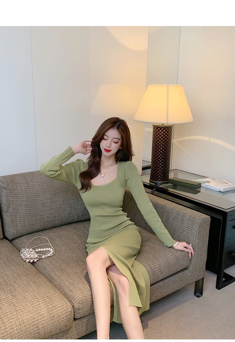 2021年秋新風冷風レディースハイエンドセンススリムスリムセクシースプリットスクエアネックニットワンピースレディース オータム 秋物 スクウェア yingd73987634096