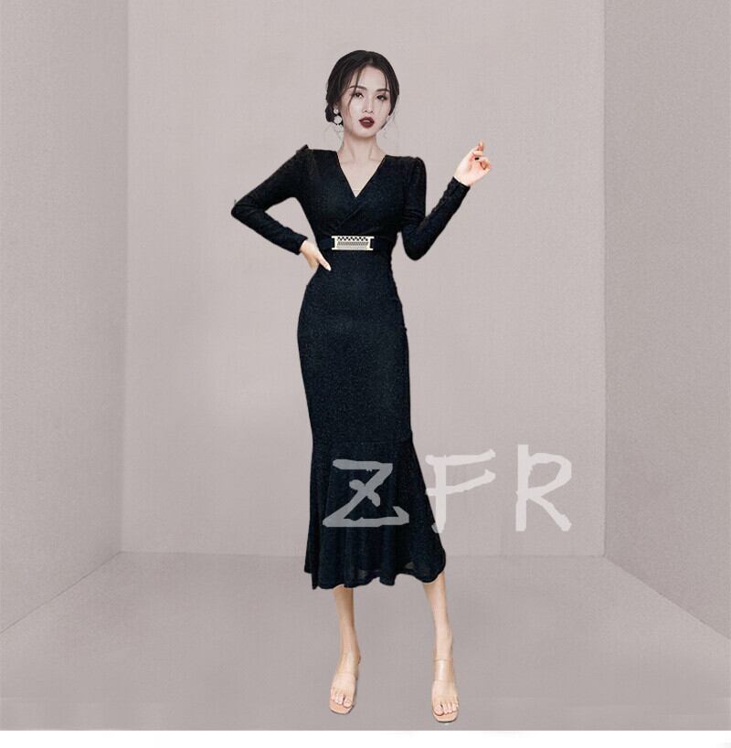 コールドウィンド婦人服ハイエンドライトラグジュアリーレディース気質セクシーフェミニティVネックスリムバッグヒップフィッシュテールドレス yingd8376770934