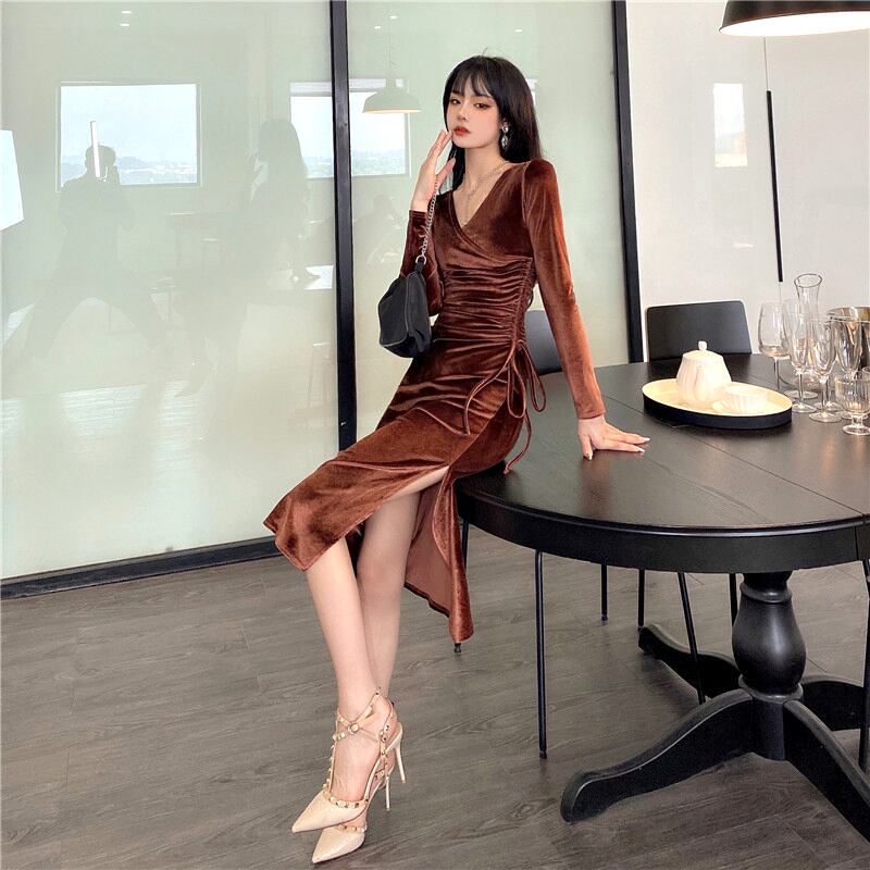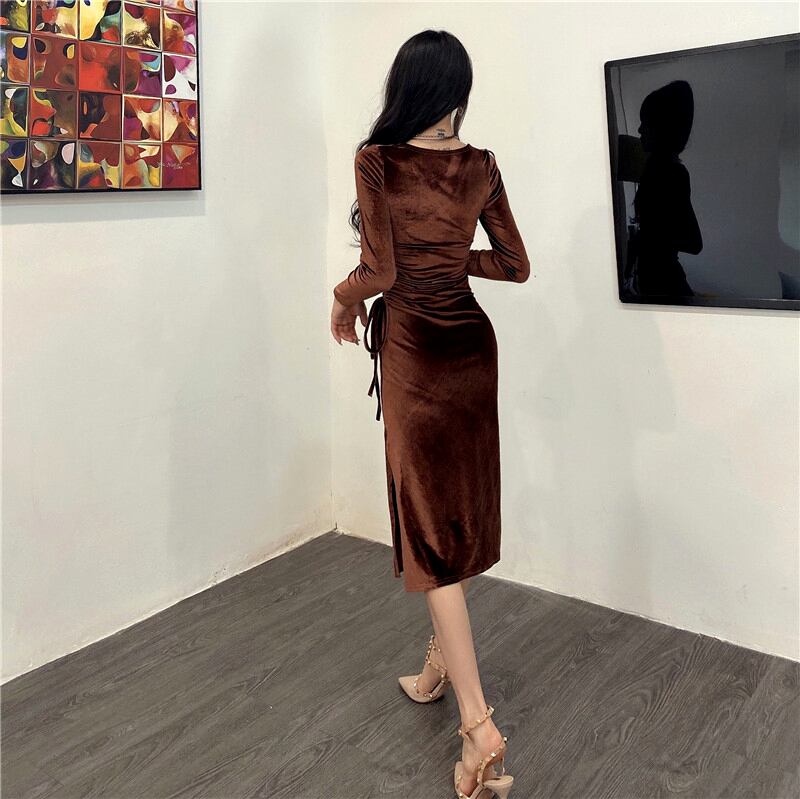 2021年秋新作フレンチシックデザインセンス巾着ウエストスリム気質ロングスリットベルベットワンピース オータム 秋物 yingd35339060728
