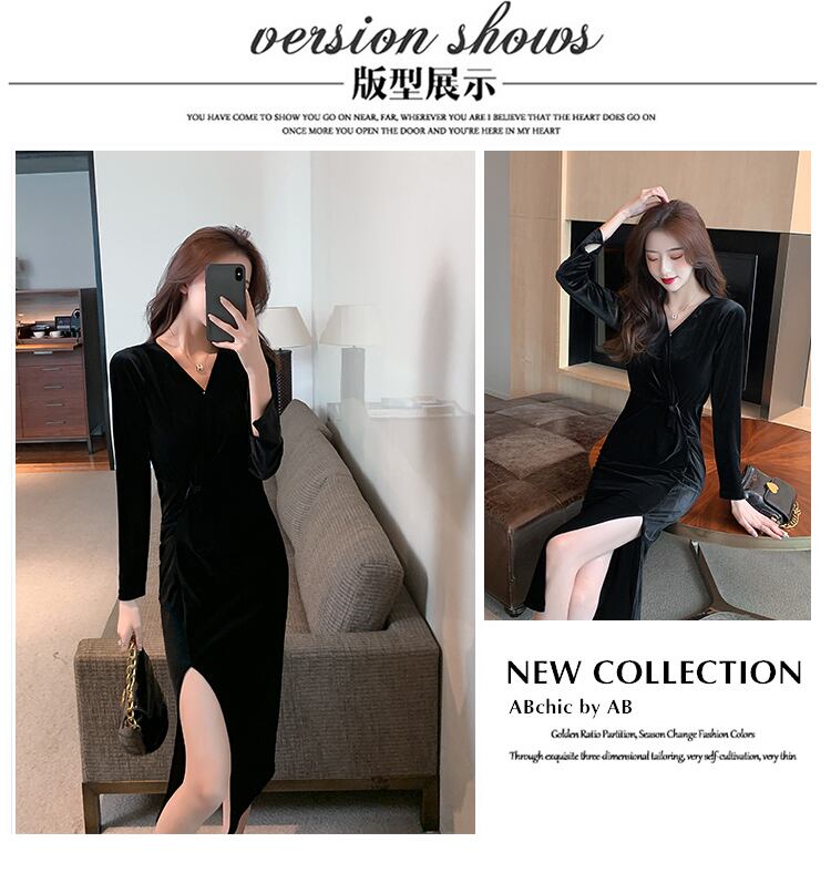 フランスのレトロなヘップバーンドレススリムフィットとスリムなVネックセクシーパッケージヒップスリット長袖ベルベットドレス女性の秋 ロング オータム 秋物 yingd46738540957