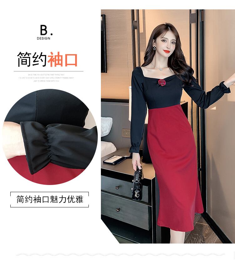 極寒風レディースハイエンドセンス軽高級レディースウエストスリム気質スクエアカラーパフスリーブステッチドレスレディース秋 オータム 秋物 スクウェア yingd47861491634