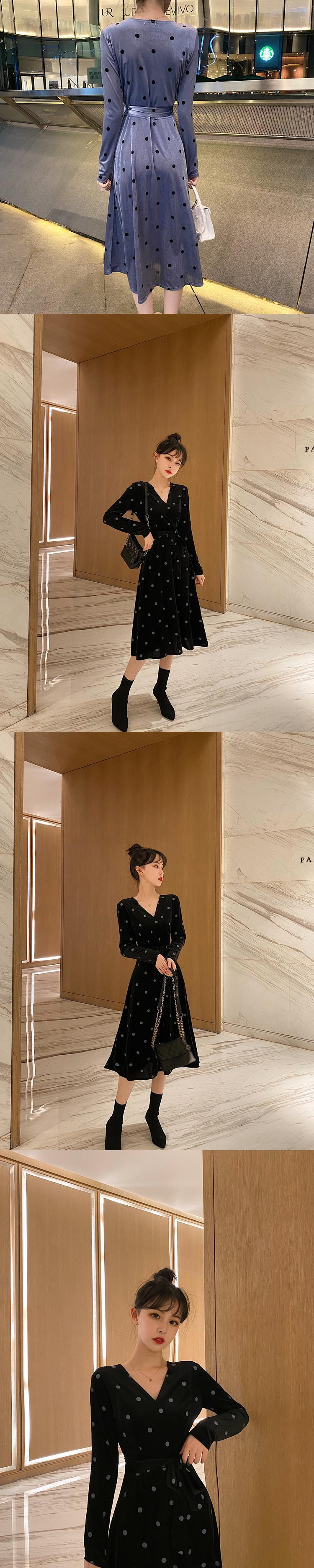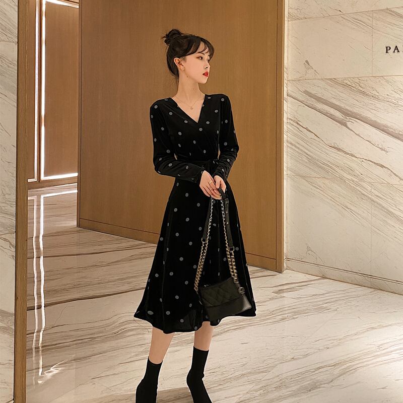 秋冬新作Vネックミドル丈ベルベットワンピースレディースウエストとスリムな香港風レトロ水玉スカート オータム 秋物 ウィンター 冬物 yingd57182404439