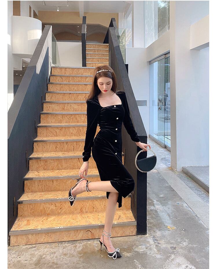 フランスのレトロなヘップバーンスタイルのリトルブラックドレスライトラグジュアリーハイエンドラグジュアリーレディースロングオーバーザニースプリットベルベットドレス秋と冬 オータム 秋物 ウィンター 冬物 yingd10481443640