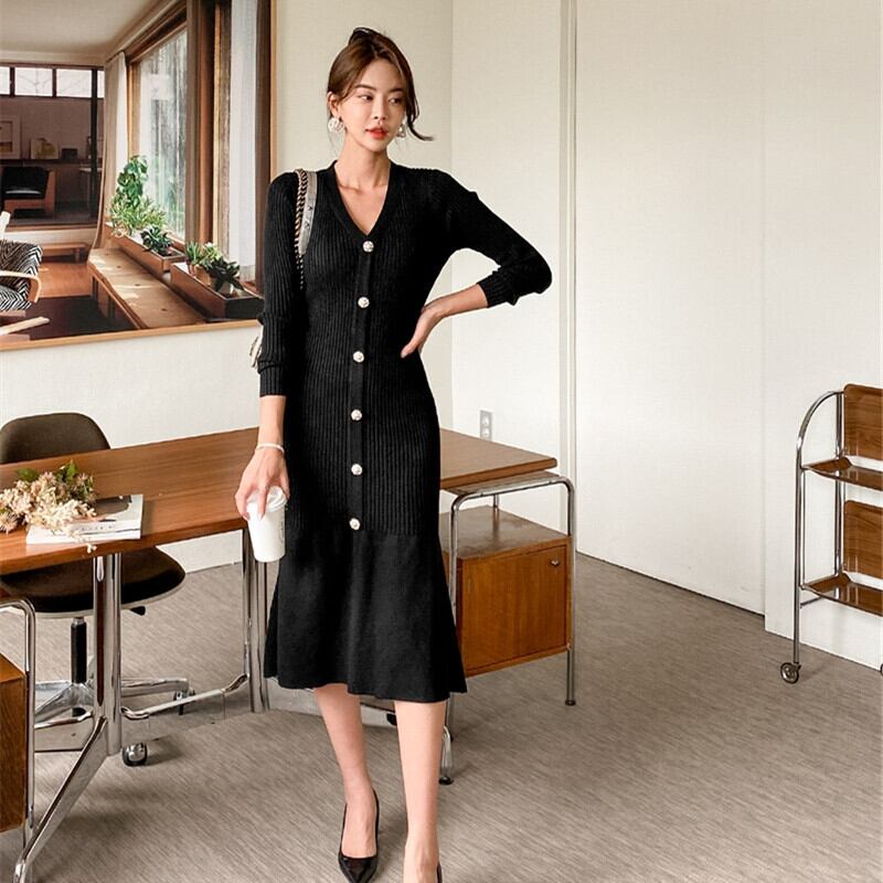 フランスのレトロなロングオーバーザニーセータードレスウエストスリム気質ハイエンドフィッシュテールバッグヒップニットドレス女性 yingd89648801711