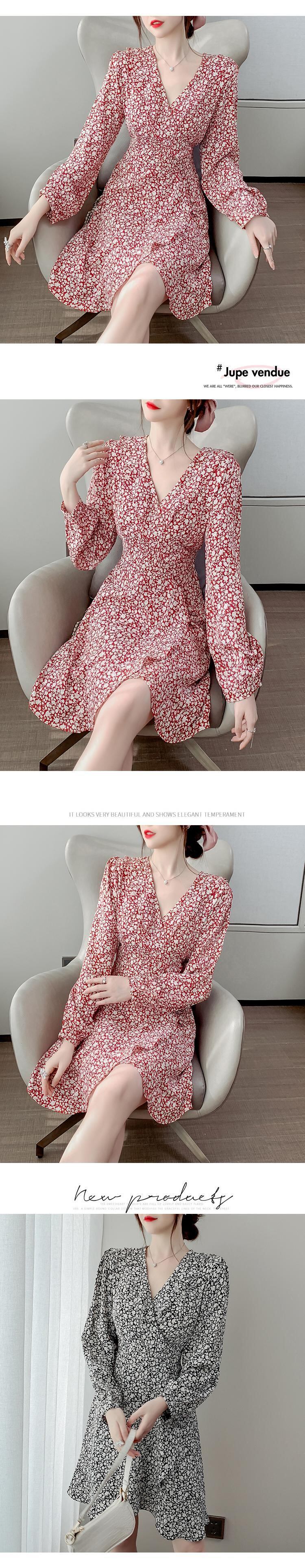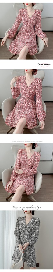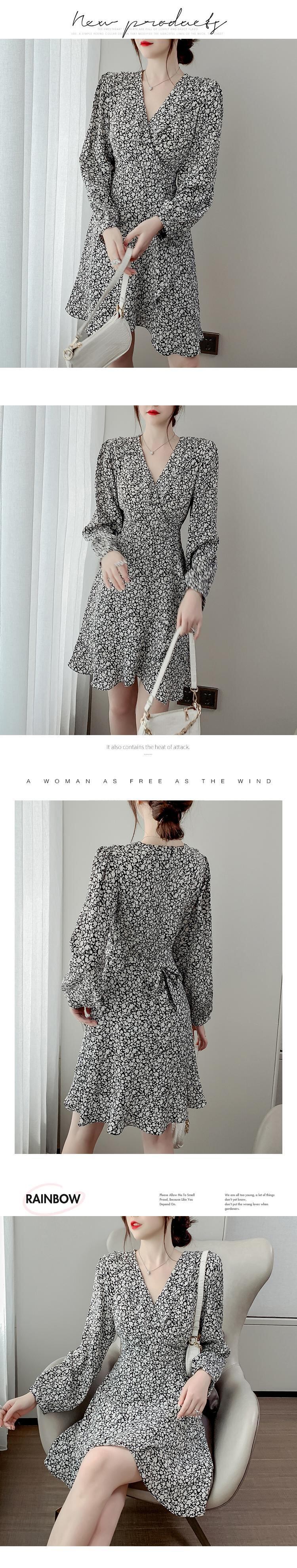 春物2022年新作レディースフレンチレトロウエストと薄手の気質Vネック長袖シフォンフローラルドレスレディース ロング スプリング 花柄 yingd86823335857