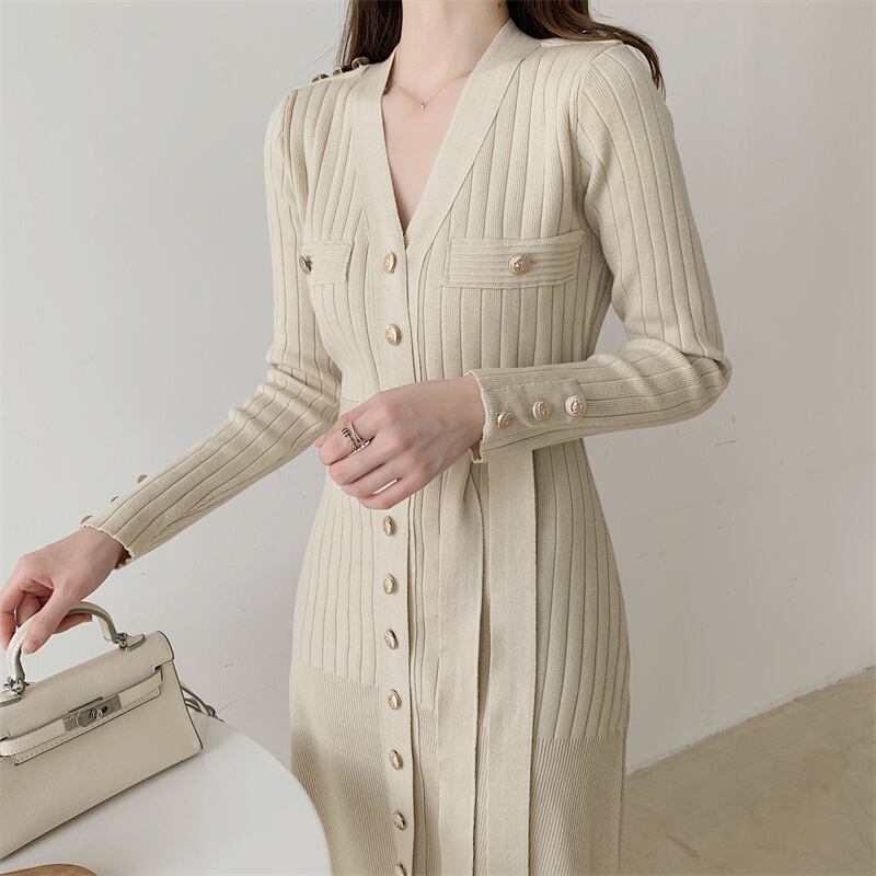 フレンチティーブレイクジェントルウィンドピュアデザイアロング膝上セータードレスシングルブレストレースアップニットドレス女性 yingd75664660222