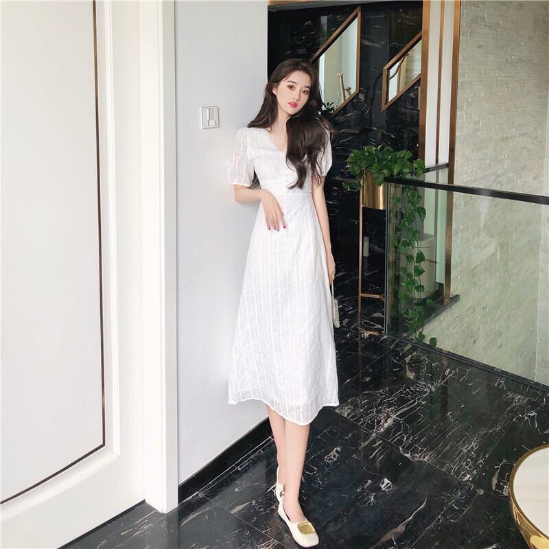 フランスのニッチな優しい風のロングドレスは薄くて高品質のVネックスリムウエストパフスリーブフェアリードレス夏 サマー 夏物 yingd30572630639