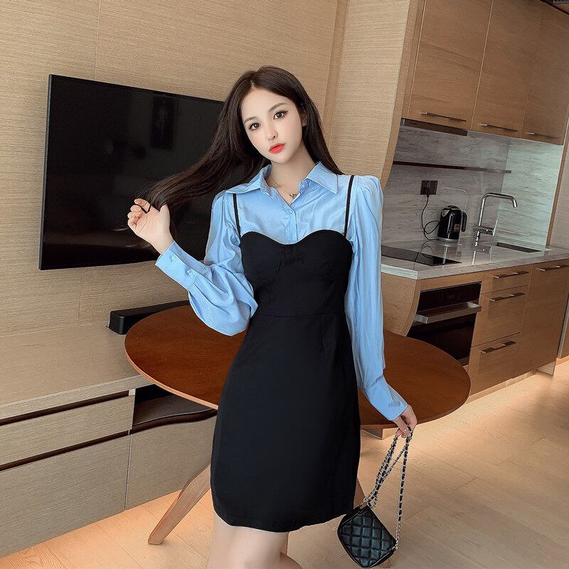 2020年秋新作フレンチレトロニッチナローウエストと薄手の気質長袖シャツサスペンダーワンピースツーピース ロング オータム 秋物 yingd90100712269
