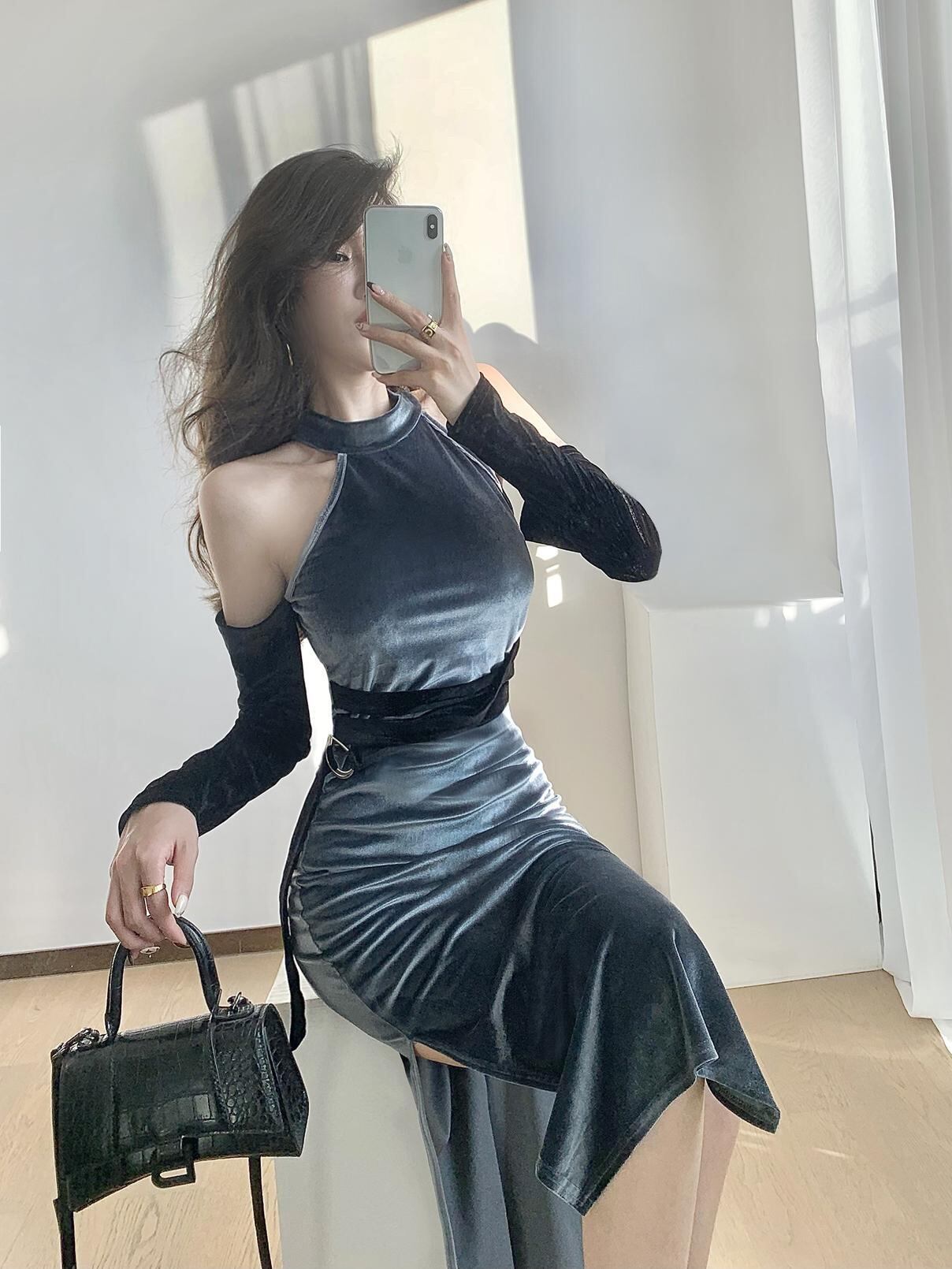 フランスのレトロシックなハイエンドライトラグジュアリーレディースニッチスリムスリムセクシーなオフショルダーベルベットドレス秋と冬 オータム 秋物 ウィンター 冬物 yingd85354227798
