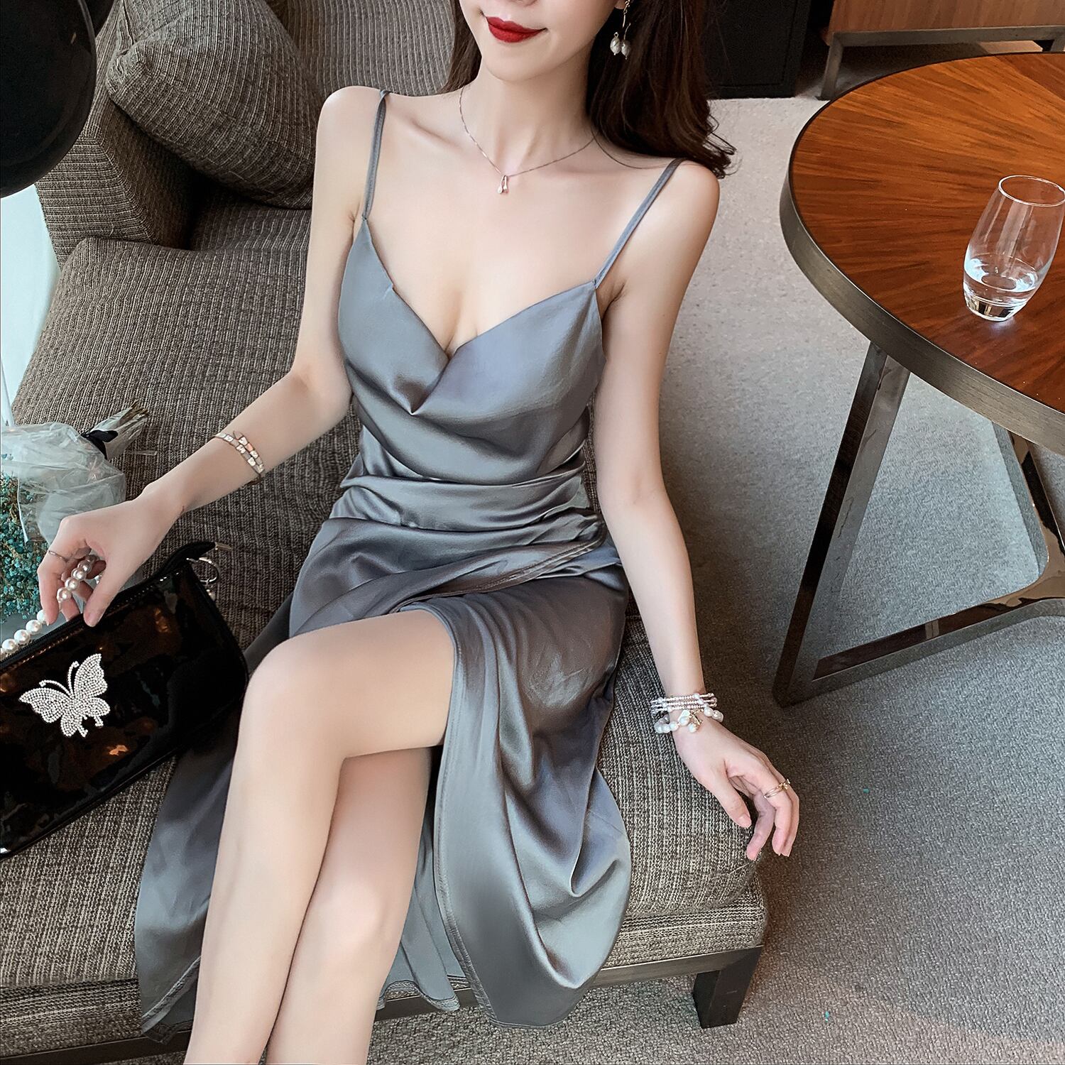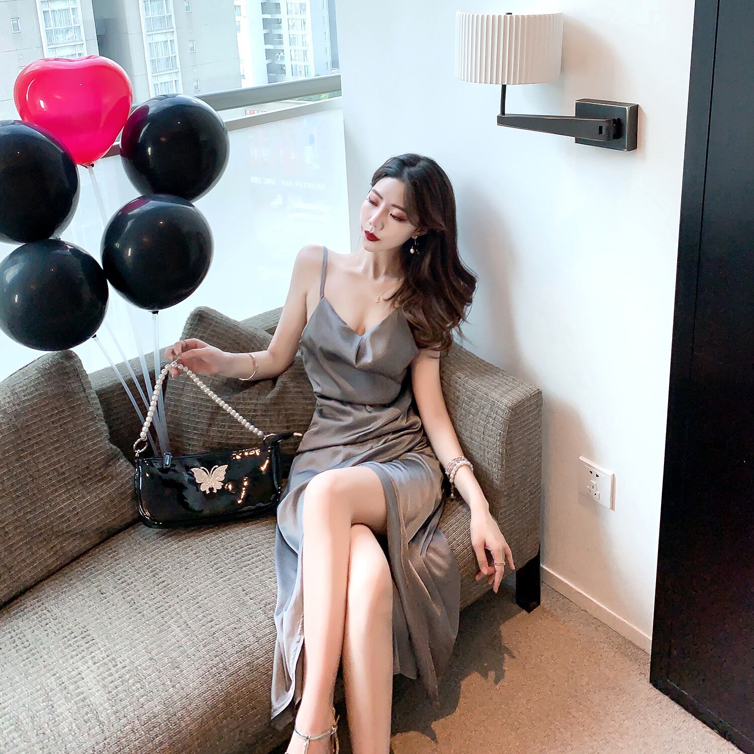 フランスのレトロなサスペンダードレスは薄くて気質の軽いおなじみのスタイルセクシーな背中の開いた慎重なマシンスプリットドレス女性 yingd31202468394