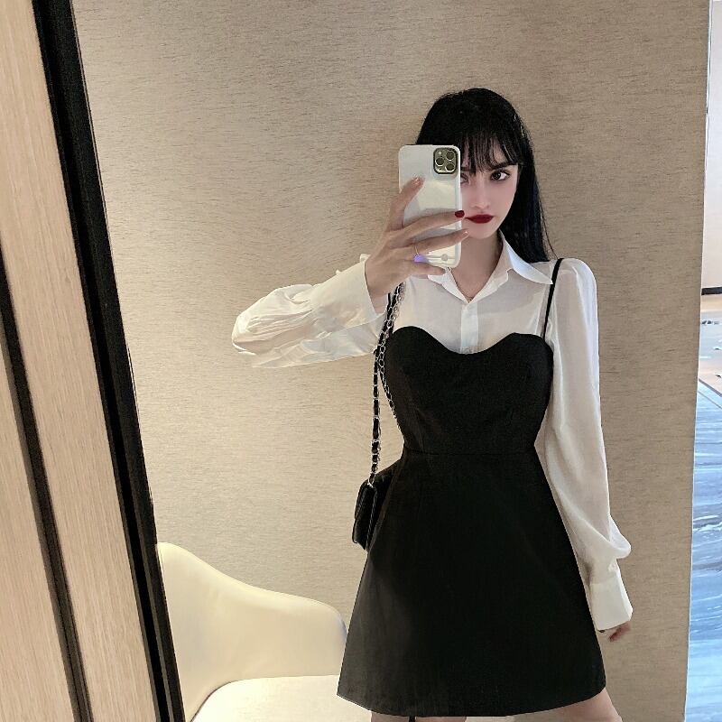 フランスのレトロな気質の女神ファンYujie長袖シャツサスペンダードレス初秋のツーピース洋服スーツ女性 ロング オータム 秋物 yingd81795166125